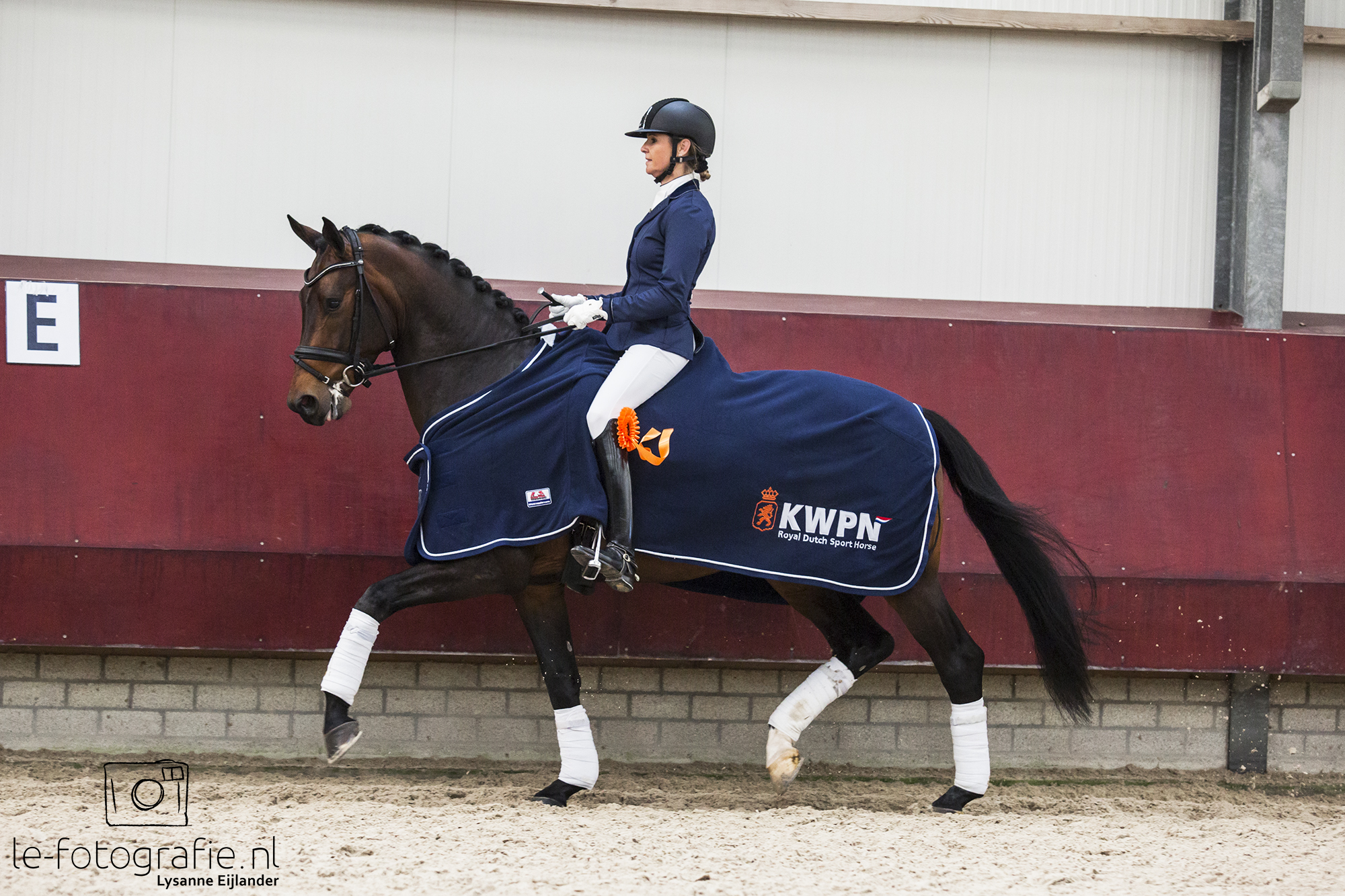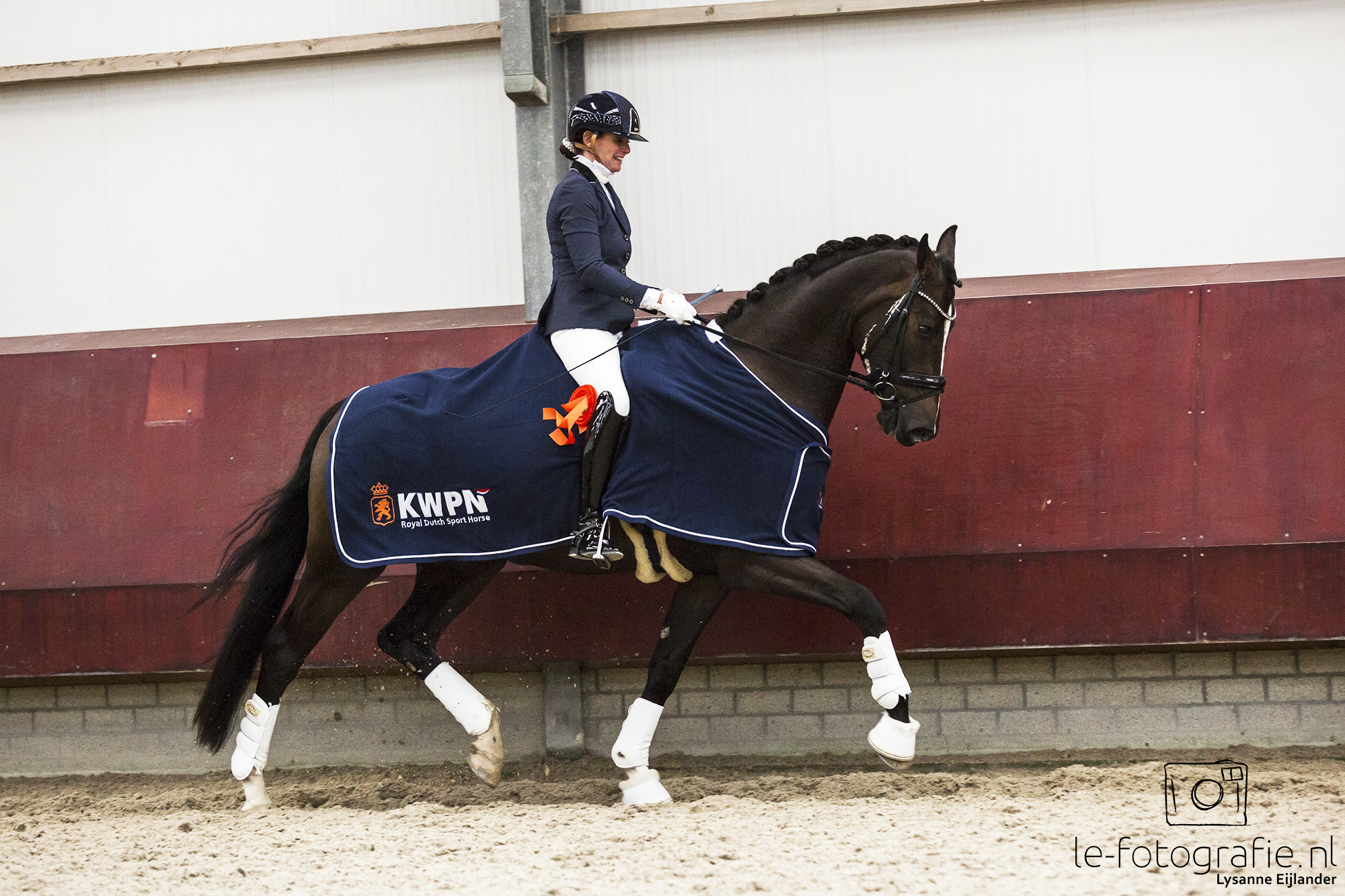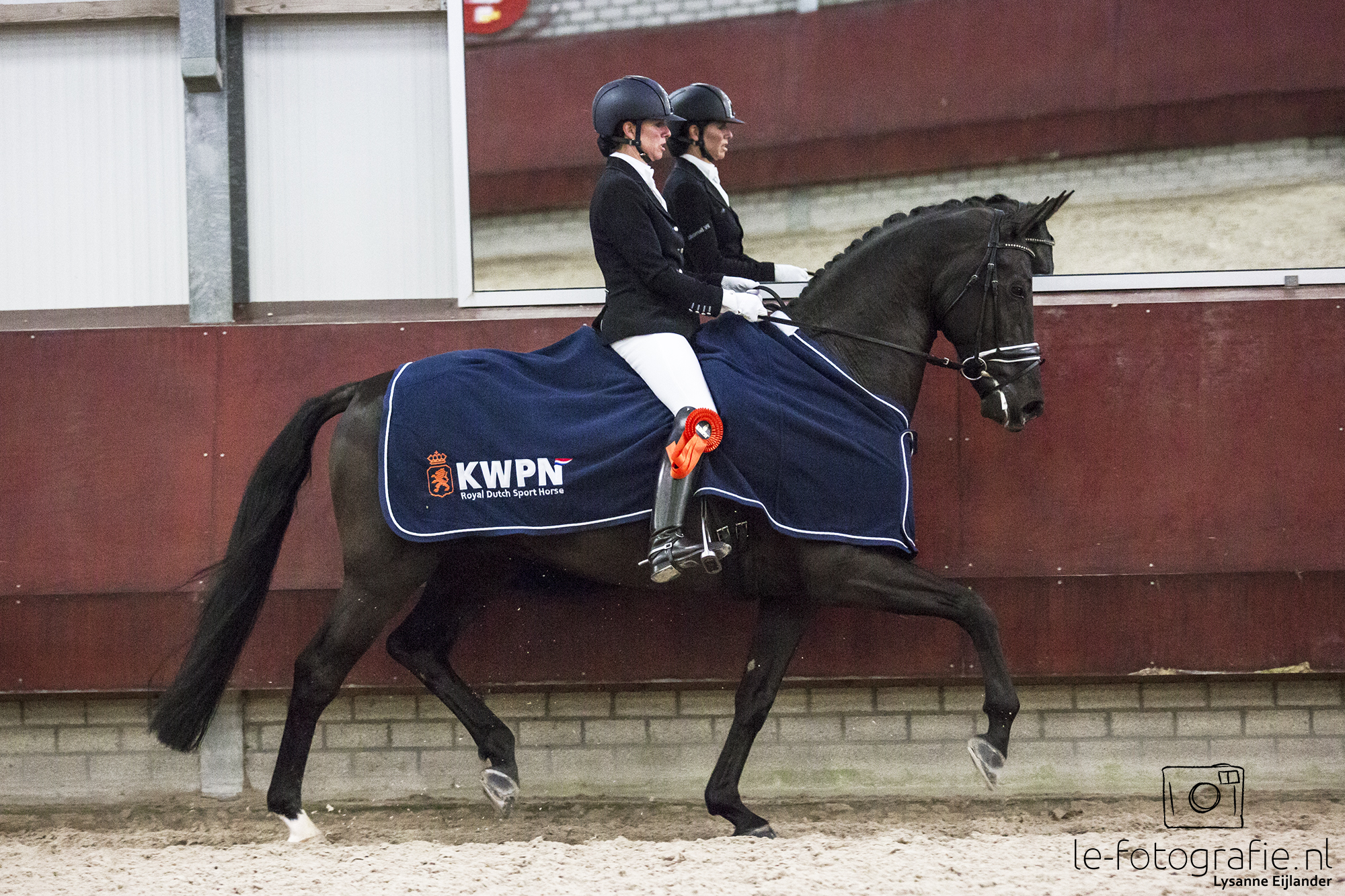 Aan kop werd geplaatst Luigi, v. Governer gefokt bij K.Reitsma te Siegerswoude en in eigendom van Dressuurstal Bernoski te Bleiswijk. Miranda Pakvis stelde de ruin netjes voor. Hij beschikt over 3 beste basisgangen met veel zelfhouding en veel souplesse. Eervol tweede werd de Ferdeaux zoon Luciano Ely T gefokt door A.T.M.Toonen-Arts te Odiliapeel. Eigenaren zijn Tullstorp Dressage Stable AB, Vankiva in Zweden en Dutch Dressage Connection B.V. te Weert. Krista Kolijn was de amazone en stelde de ruin zeer goed voor. Vooral de draf en galop vielen op waarbij ook veel zelfhouding werd getoond. De derde plaats was voor de zeer charmante elite merrie Lakewood Tarpania van fokker/eigenaar A.P.G. de Lange te Swifterbant. In het zadel Marije van Kersbergen. De dochter van Charmeur heeft een fraai front, haar souplesse en zeer goede draf vielen op.