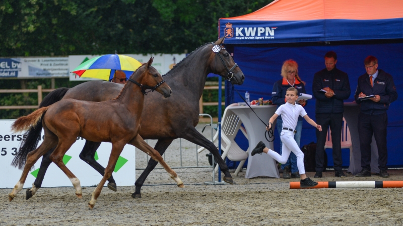 Beide keuringsdagen konden in Heerjansdam rekenen op het nodige publiek. Fokkerij leeft er duidelijk en dat geldt voor zowel jong als oud. Zo was Jan Timmerman uit Moordrecht beide dagen aanwezig. Op donderdag alleen om te kijken, maar vrijdag bracht zijn dochter het veulen Rafeero Altena (v.Spielberg) voor. Jan is een verdienstelijk fokker, want de goedgekeurde hengst Ufo werd geboren bij hem op stal alsmede het Olympiadepaard Badinda Altena. Hij is inmiddels 88 jaar en daarmee maar liefst 77 jaar ouder dan de jongste deelnemer van de dag, Thijs van Rossum. In 2020 insemineerde hij onder begeleiding van dierenarts en zijn moeder, Pascale Derijks uit Pijnacker, de merrie Happy Go Lucky (v.Apache) met sperma van Le Formidable. Hieruit werd het merrieveulen Rotterdam geboren. Thijs besliste onlangs dat hij naar de keuring wilde met zijn veulen. De familie nam een vrije dag en ze waren er bij toen Rotterdam zich uitstekend liet zien. Ze kreeg helaas geen plaats in de finale, maar dat lag zeker niet aan haar voorbrenger, want Thijs kweet zich uitstekend aan zijn taak. Hij krijgt al enige tijd rijles van Paulien Chardon bij manege Chardon en zijn grote idool is Joop van Uytert. De nieuwe generatie hengstenhouder is dus al opgestaan!