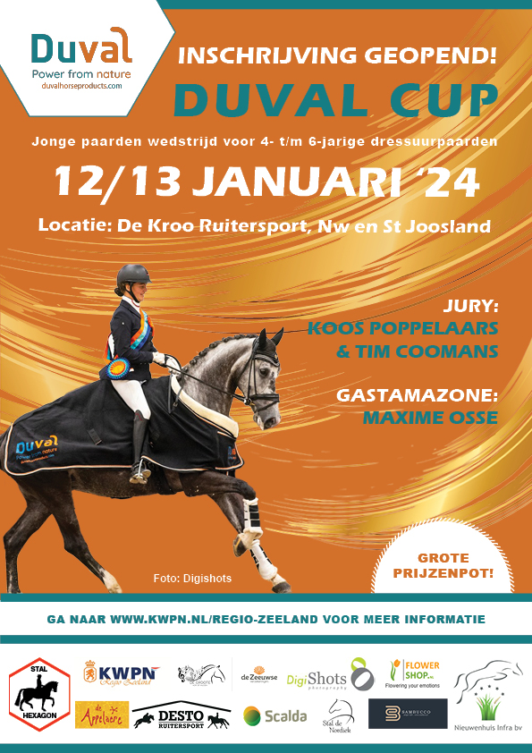 De Duval Dressage Cup wordt gereden in tweetallen. De paarden rijden, de proef van een jaargang jonger. De vierjarigen rijden een aparte proef, de vijf- en zesjarigen rijden in de PAVO Cup formule (van een jaar jonger). Goedgekeurde hengsten zijn uitgesloten van deelname. Je rijdt dus in tweetallen je proef in de rustige ambiance van de professionele accommodatie van De Kroo Ruitersport.