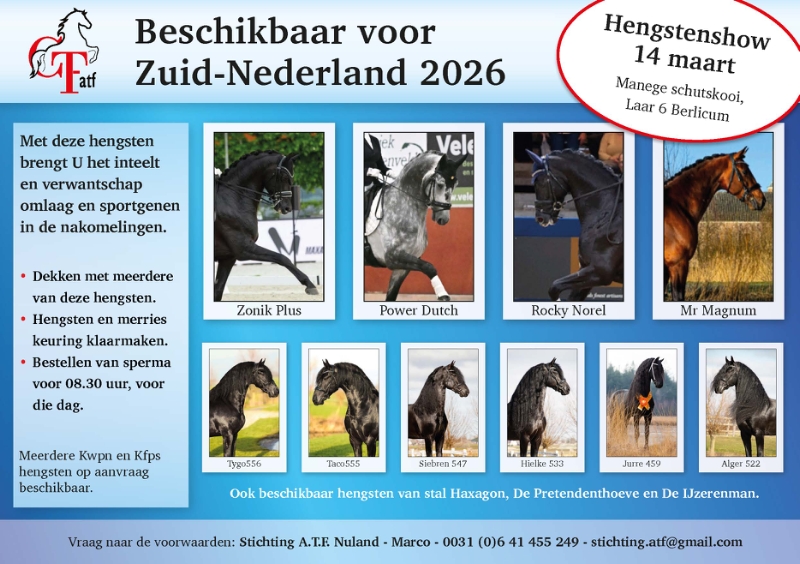 Zonik Plus is voor dit jaar voor Midden en Zuid-Nederland beschikbaar bij ons en tevens de hengsten van stal Hexagon, Van Norel, Sjaak Laarakkers, en Stal van der Grijp, en natuurlijk van diverse andere stallen. Dit is middels gratis insemineren aan huis.