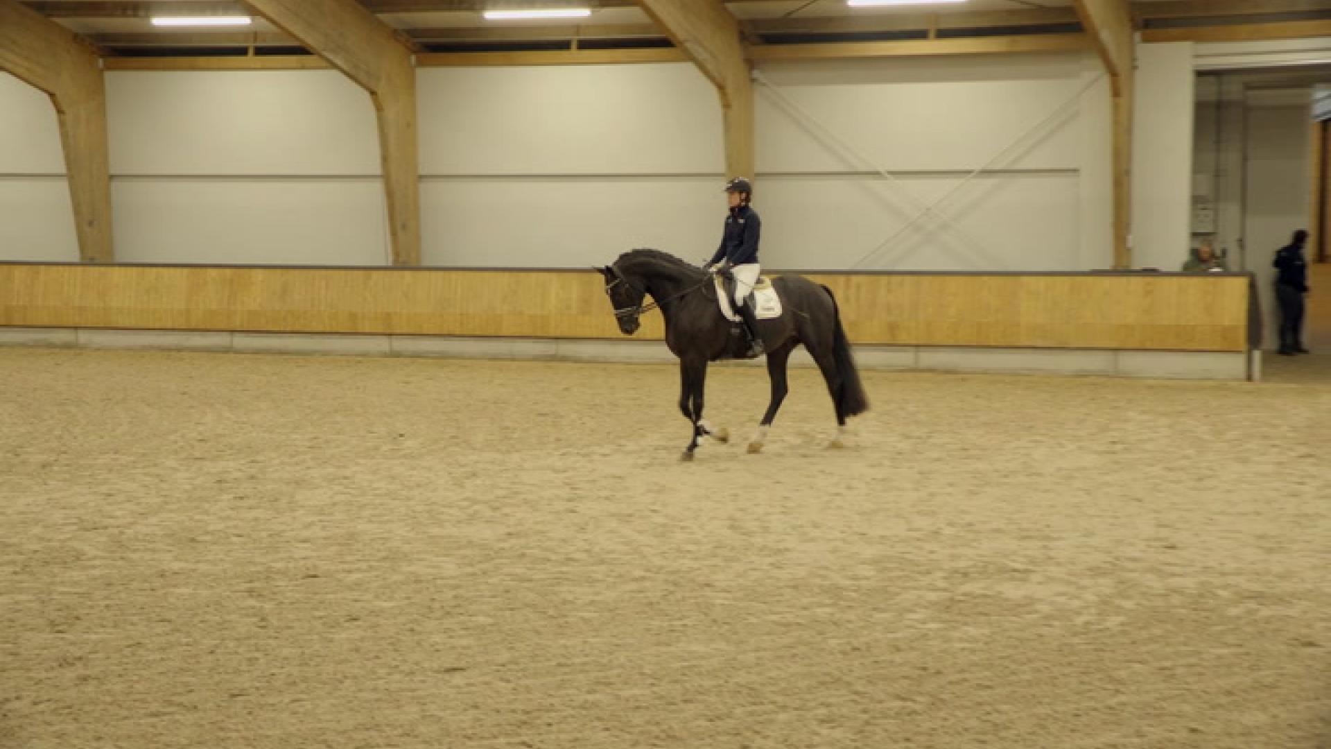 De draf is ruim voldoende van ruimte, met een actief gebruik van het achterbeen en ruim voldoende balans.
