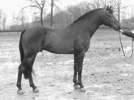 Hengst met veel uitdrukking. Het achterbeen is vrij sterk gebogen. De hengst staat hoog in de verzenen.