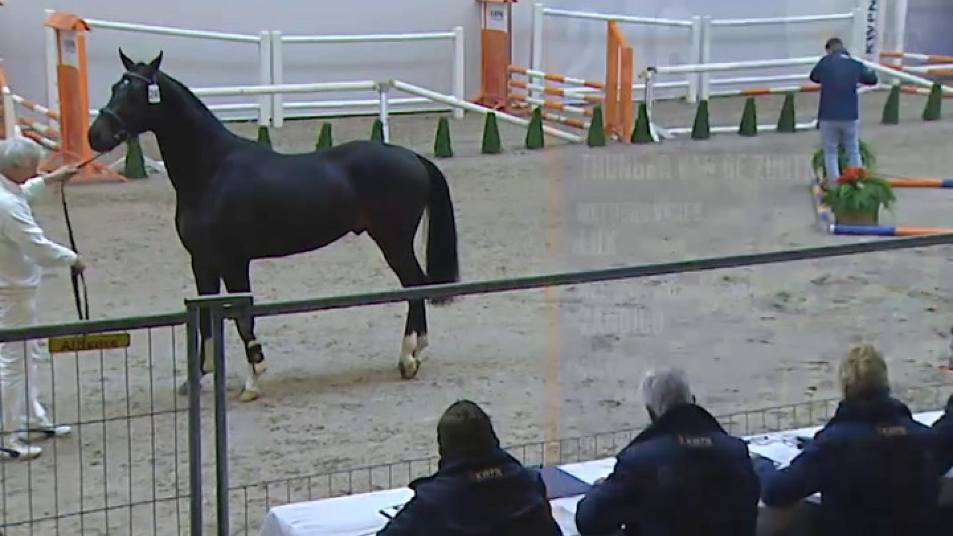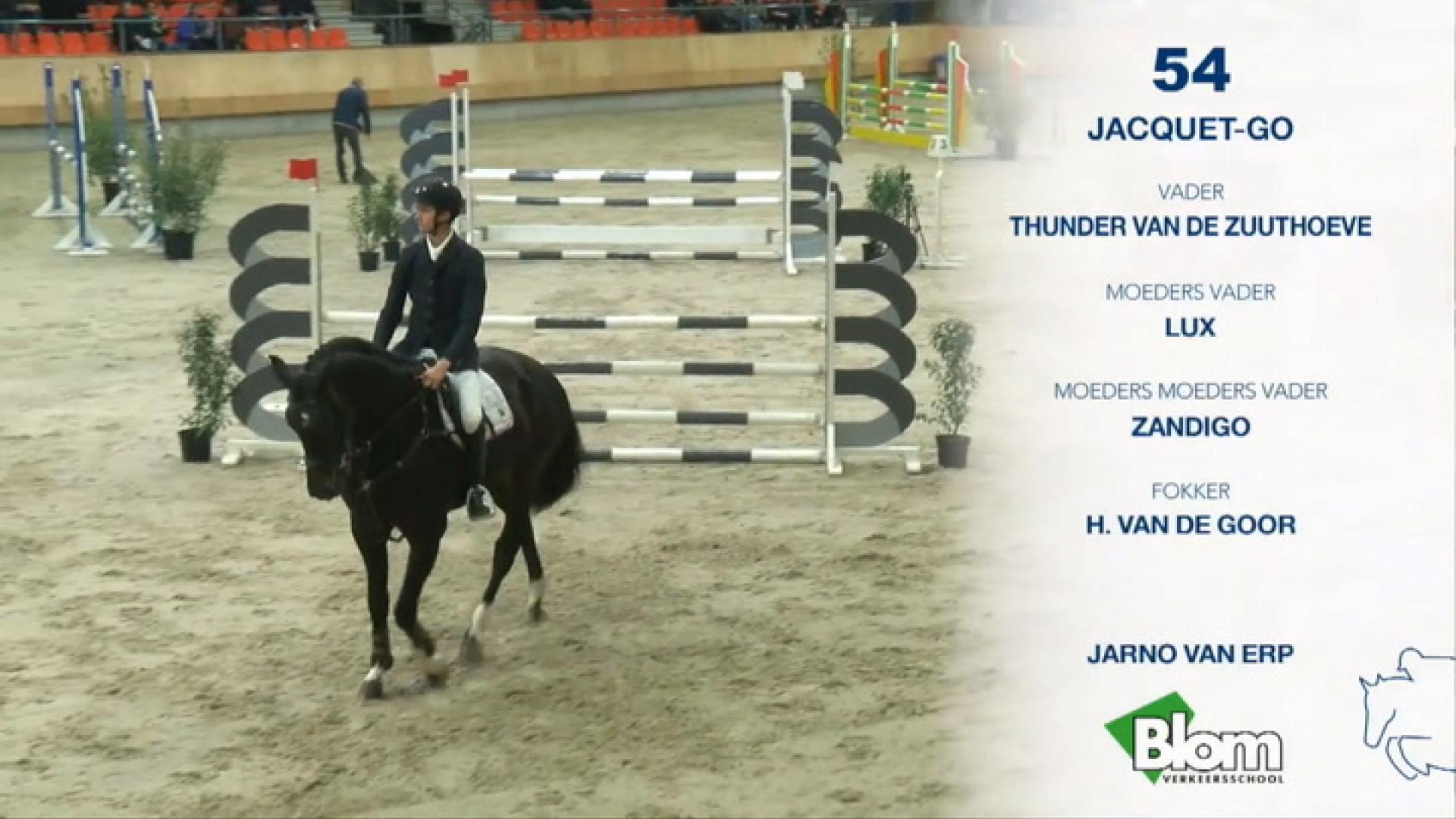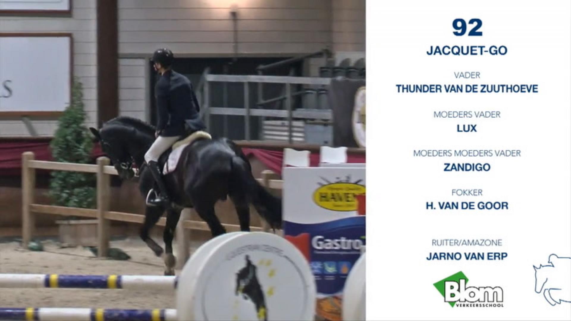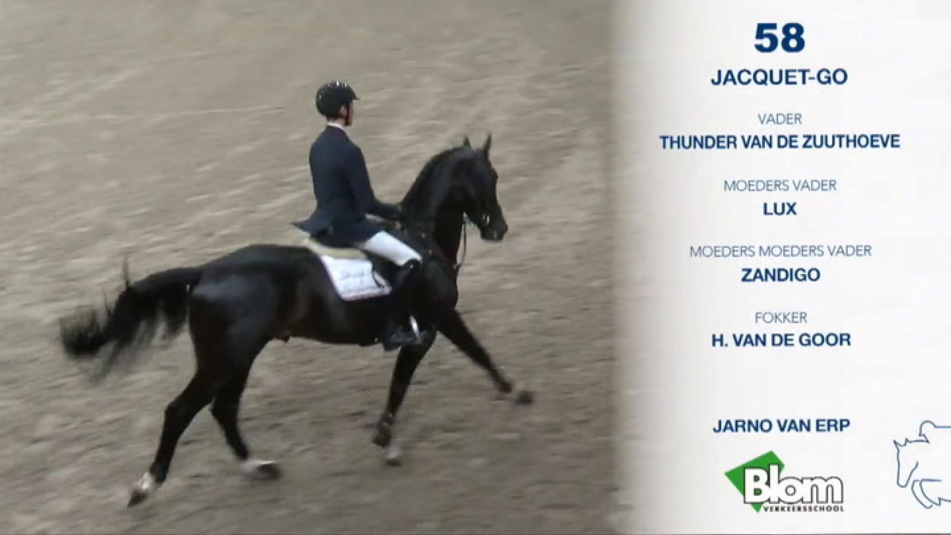 Jacquet-Go (Thunder van de Zuuthoeve x Lux x Zandigo)Jacquet-Go toonde een wisselende collectie veulens wat betreft ontwikkeling en langgelijndheid die veel uitstraling, een aansprekende voorhand en een goede schouderpartij hebben. De hals is lang, goed bespierd maar ook verschillende keren wat verticaal gesteld. De romprichting is meermalen neerwaarts. De veulens hebben een sterke bovenlijn. Het voorbeen is correct gesteld. Het achterbeen is overwegend correct gesteld. De stap is correct en ruim voldoende van ruimte. De draf is ruim voldoende van ruimte, vertoont veel afdruk met een wat duwend achterbeen. De galop is lichtvoetig, goed van ruimte en heeft veel balans en lichaamsgebruik.