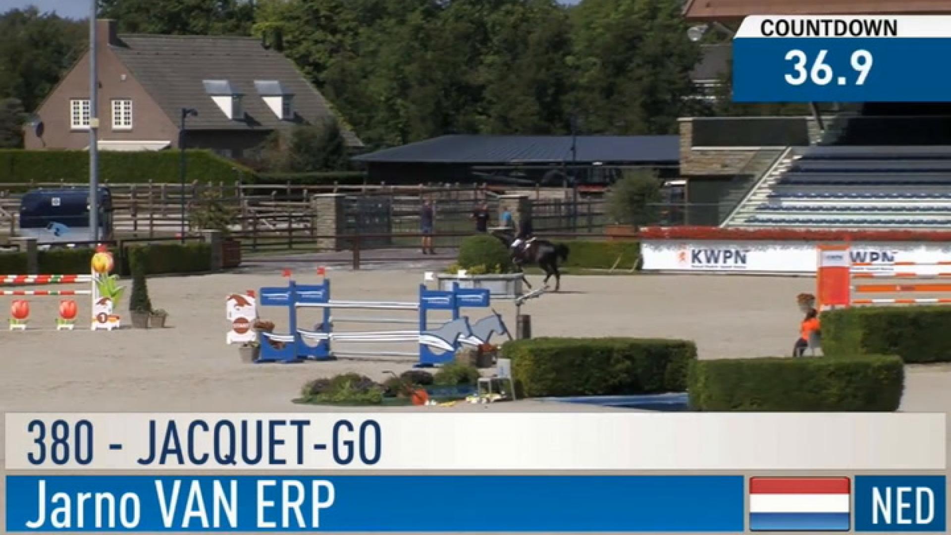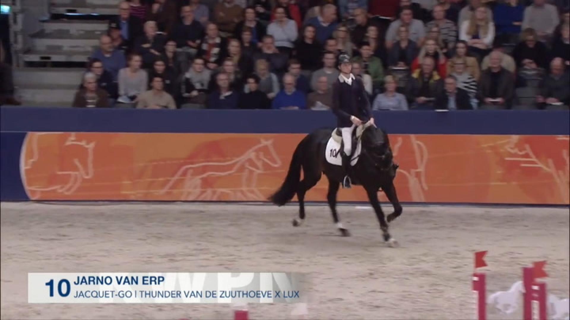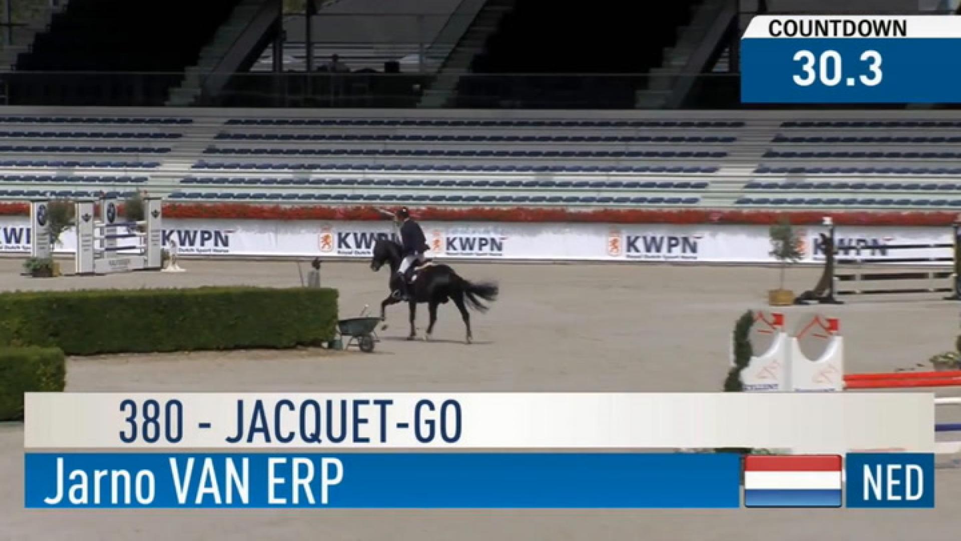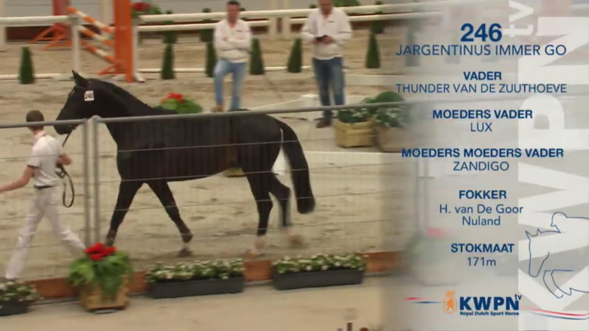 Jacquet-Go (Thunder van de Zuuthoeve x Lux x Zandigo)Jacquet-Go toonde een wisselende collectie veulens wat betreft ontwikkeling en langgelijndheid die veel uitstraling, een aansprekende voorhand en een goede schouderpartij hebben. De hals is lang, goed bespierd maar ook verschillende keren wat verticaal gesteld. De romprichting is meermalen neerwaarts. De veulens hebben een sterke bovenlijn. Het voorbeen is correct gesteld. Het achterbeen is overwegend correct gesteld. De stap is correct en ruim voldoende van ruimte. De draf is ruim voldoende van ruimte, vertoont veel afdruk met een wat duwend achterbeen. De galop is lichtvoetig, goed van ruimte en heeft veel balans en lichaamsgebruik.