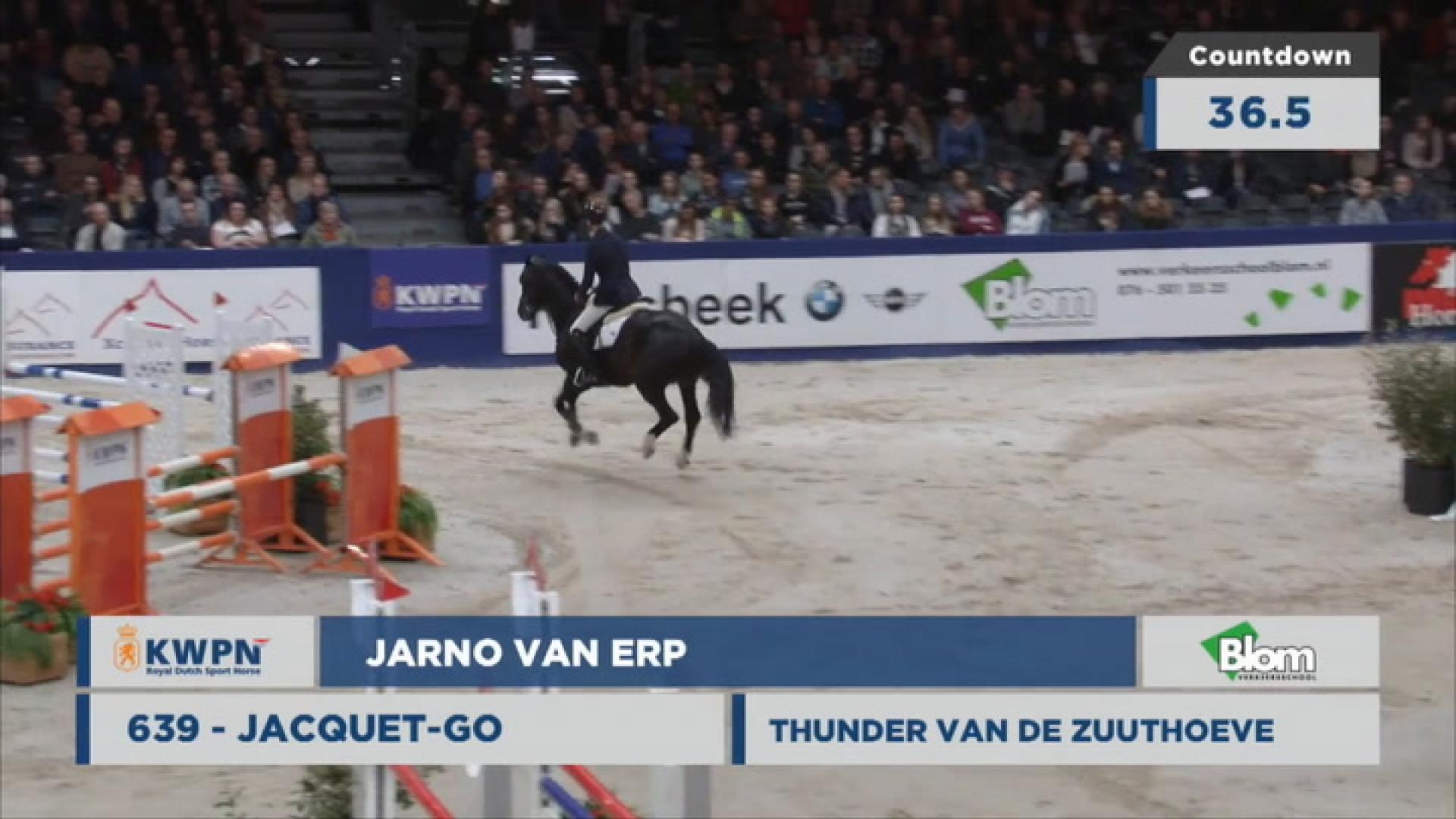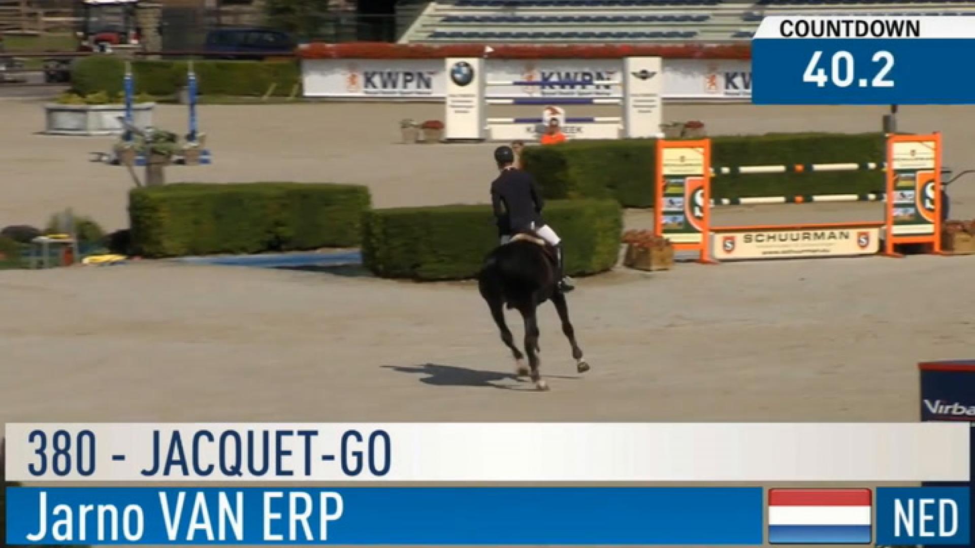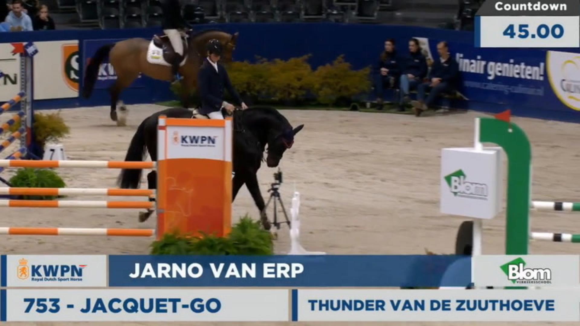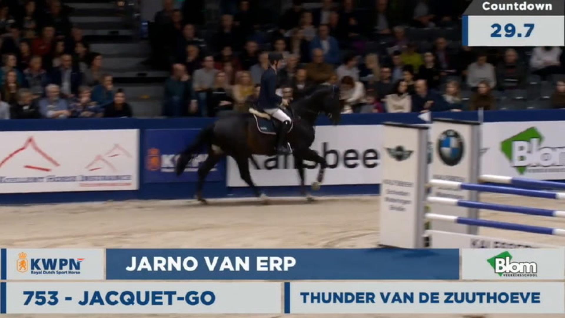 Jacquet-Go (Thunder van de Zuuthoeve x Lux x Zandigo)Jacquet-Go toonde een wisselende collectie veulens wat betreft ontwikkeling en langgelijndheid die veel uitstraling, een aansprekende voorhand en een goede schouderpartij hebben. De hals is lang, goed bespierd maar ook verschillende keren wat verticaal gesteld. De romprichting is meermalen neerwaarts. De veulens hebben een sterke bovenlijn. Het voorbeen is correct gesteld. Het achterbeen is overwegend correct gesteld. De stap is correct en ruim voldoende van ruimte. De draf is ruim voldoende van ruimte, vertoont veel afdruk met een wat duwend achterbeen. De galop is lichtvoetig, goed van ruimte en heeft veel balans en lichaamsgebruik.