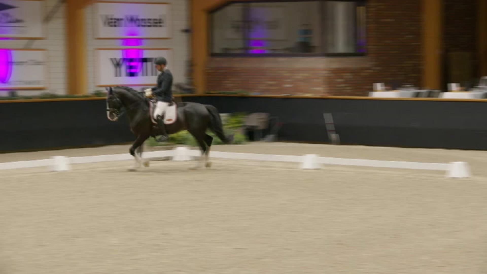 De galop is lichtvoetig, goed van ruimte, ruim voldoende gedragen met een ruim voldoende houding.