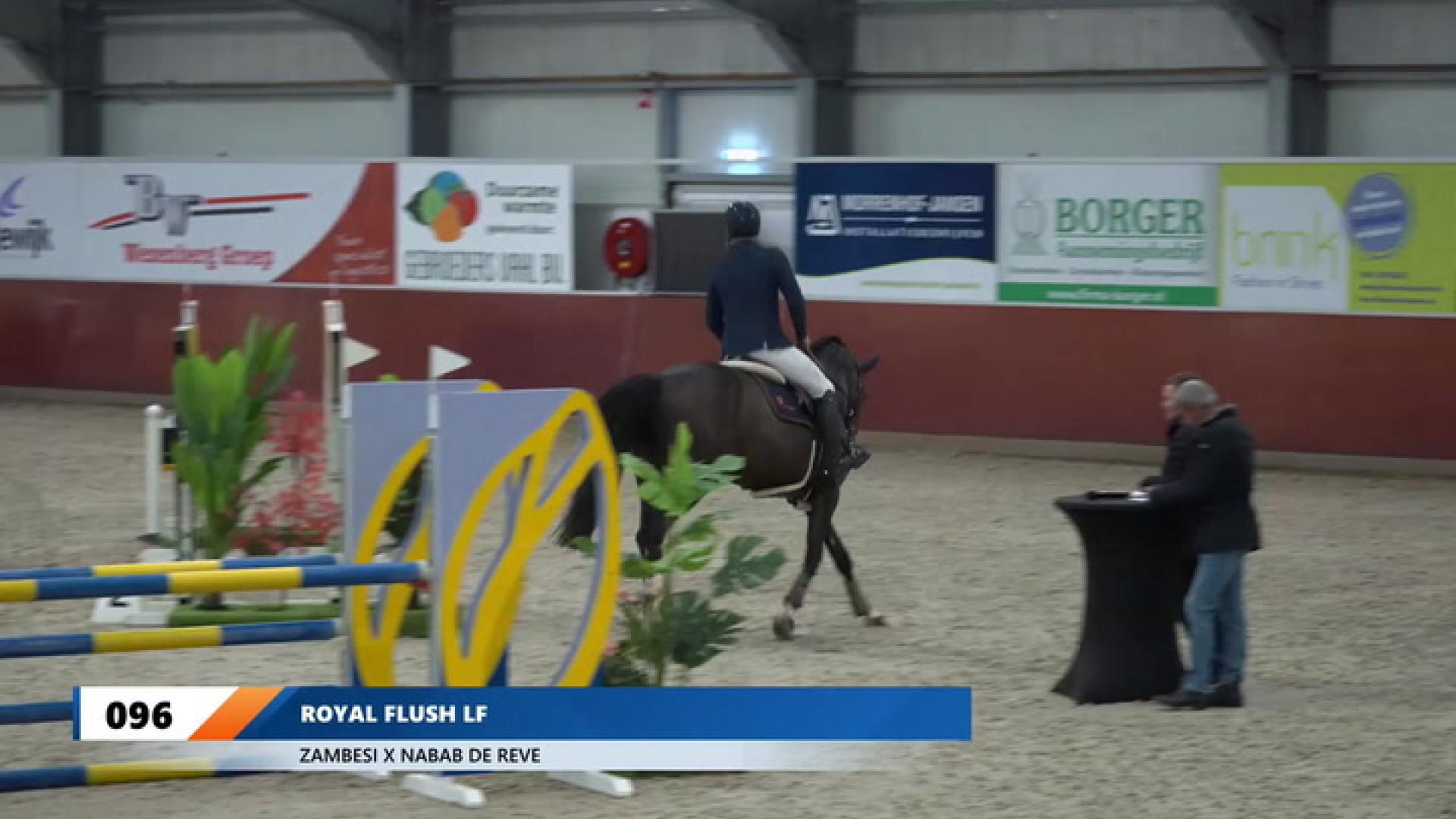 Royal Flush LF is een hengst met een goede instelling die zich ruim voldoende laat bewerken. De stap en draf zijn correct en voldoende van ruimte en souplesse. In beweging heeft de hengst een goede houding en balans. De galop is ruim, met een goede balans en voldoende souplesse. Royal Flush LF springt met het lichaam naar boven, waarbij de afdruk opvalt en is daarbij ook voorzichtig. De hengst springt met een goede schoft-schouder techniek. Hij maakt de sprong ruim voldoende af en springt met ruim voldoende lichaamsgebruik. Royal Flush LF toont vermogen aan de sprong en heeft daarbij veel overzicht. Als springpaard heeft Royal Flush ruim voldoende tot veel aanleg en geeft zijn ruiter een ruim voldoende gevoel.