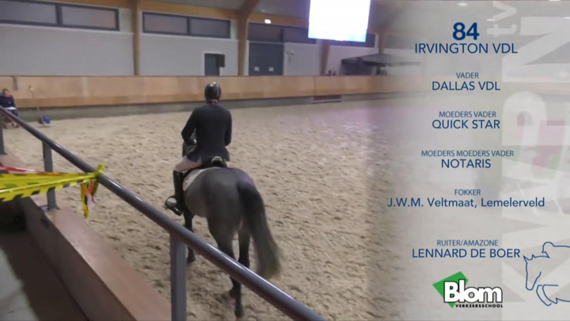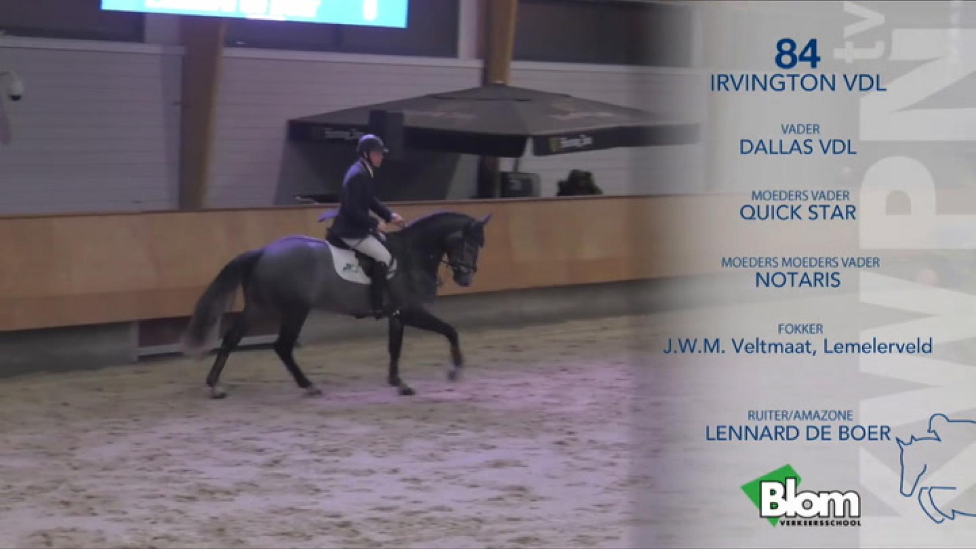 Exterieur:Irvington VDL is een ruim voldoende ontwikkelde hengst, die ruim voldoende in het rechthoeksmodel staat. Het hoofd is voldoende sprekend. De nek is voldoende van lengte met een zware hoofd-hals verbinding. De hals is voldoende van vorm, zou meer lengte moeten hebben en is ruim voldoende bespierd. De schoft is ruim voldoende tot goed ontwikkeld en ruim voldoende tot goed van lengte. De schouder is ruim voldoende tot goed van lengte en goed van ligging. De rug is ruim voldoende van lengte en goed van bespiering. De lendenen zijn ruim voldoende bespierd en goed aangesloten. De croupe is goed van ligging, ruim voldoende van lengte en goed bespierd. De broekspier is ruim voldoende tot goed van lengte. Het voorbeen is van terzijde gezien ingesnoerd en van voren gezien correct gesteld. Het achterbeen is correct gesteld. De koten zijn ruim voldoende van lengte en correct gesteld. Het fundament is ruim voldoende ontwikkeld en voldoende van kwaliteit. De voeten zijn wat smal, goed ontwikkeld en voldoende van kwaliteit. De verzenen goed ontwikkeld.