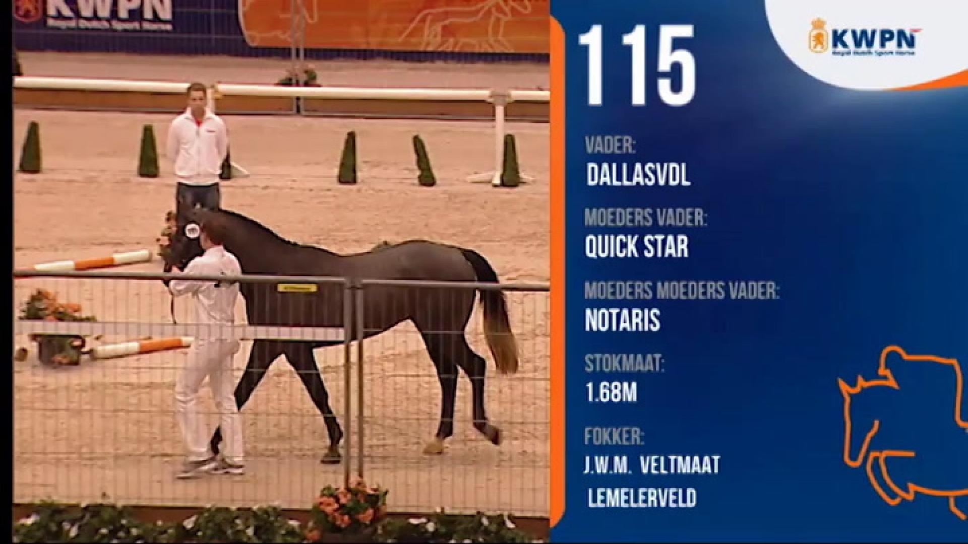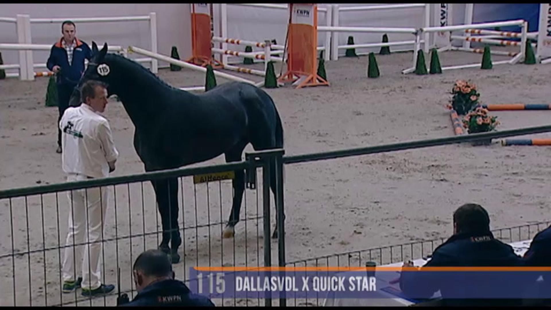 De draf is ruim voldoende van ruimte met een goede houding en een ruim voldoende ondertreden/dragend achterbeen.