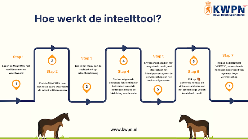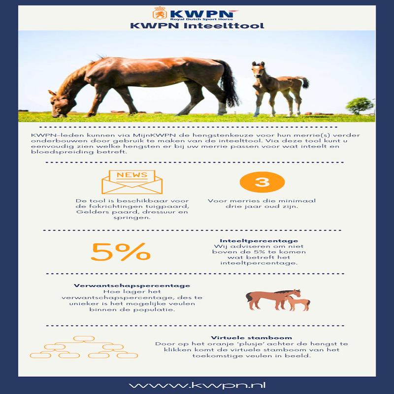 De KWPN-inteelttool is niet voor iedereen even duidelijk. Om u op weg te helpen is er een handleiding opgesteld die u stap voor stap uitlegt hoe u de KWPN-inteelttool gebruikt. Open de handleiding en pas de online tool toe op uw merrie(s).