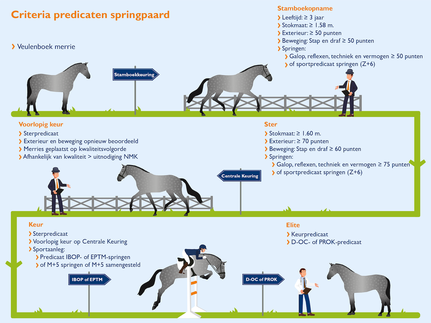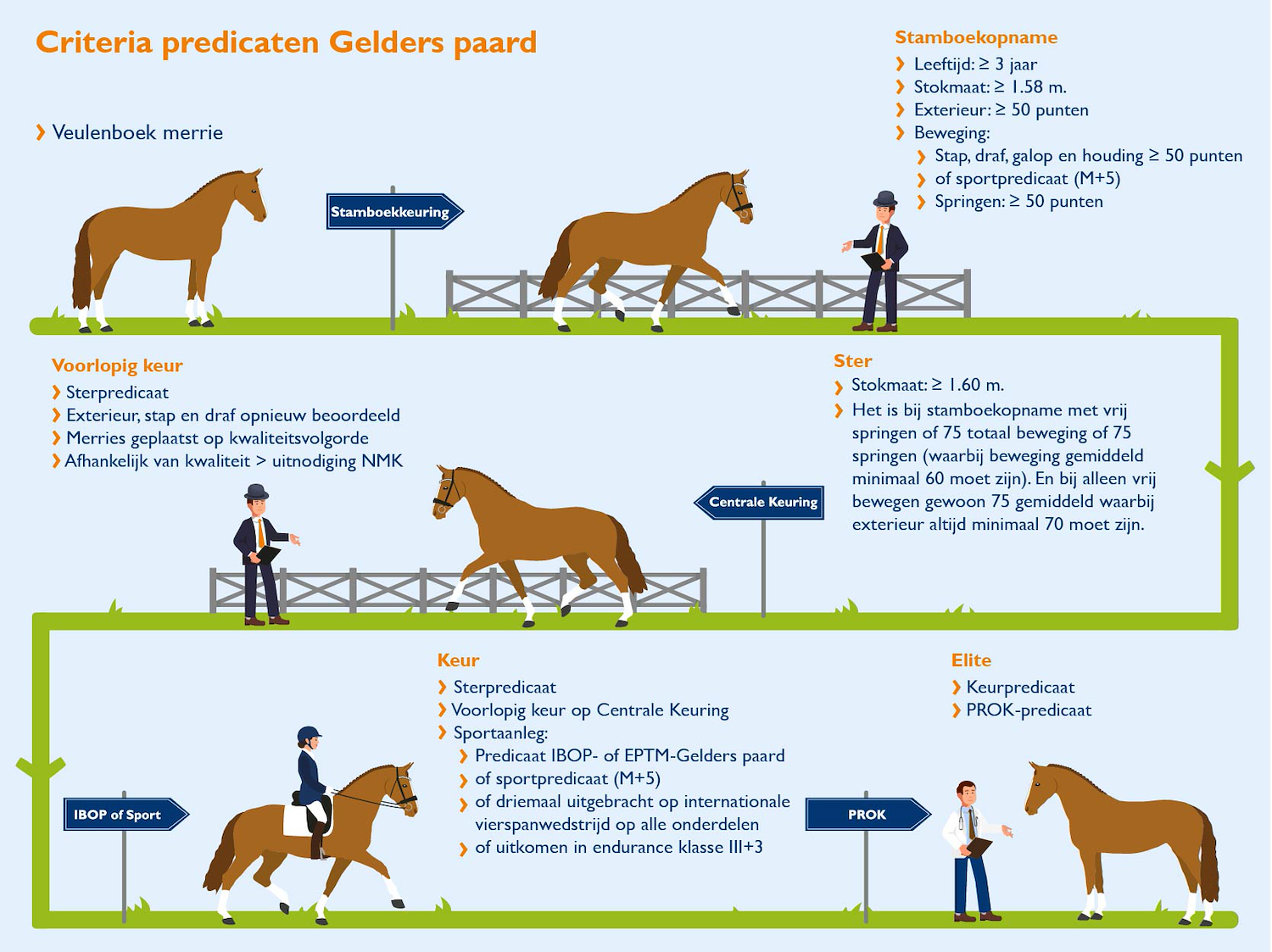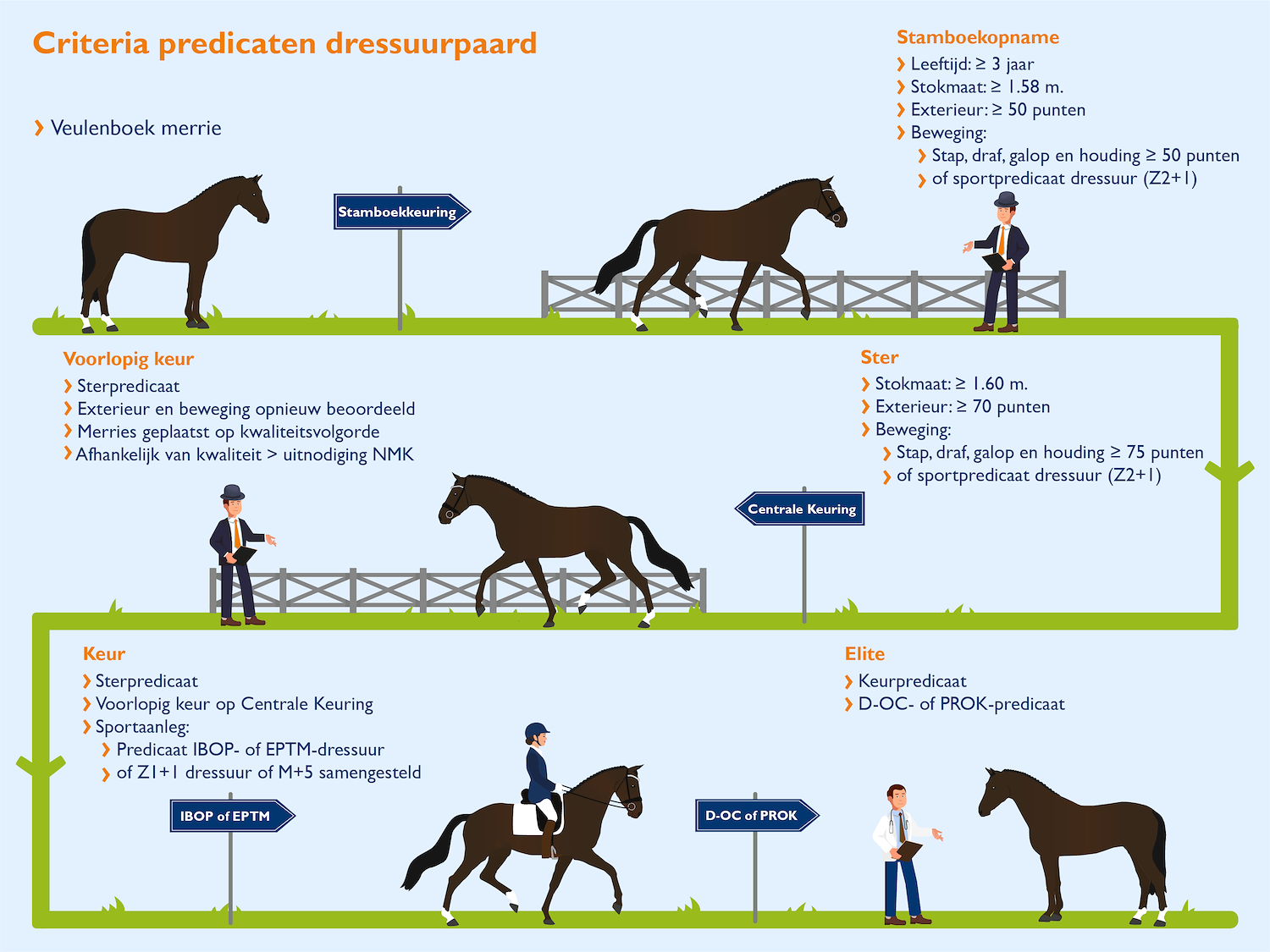 Om aan een keuring deel te mogen nemen en om daar vervolgens ook eventueel in aanmerking te komen voor predicaten zijn er verschillende criteria waaraan uw paard moet voldoen. Deze zijn allemaal terug te vinden in de reglementen, maar wij hebben deze ook eenvoudig voor u in beeld gebracht. De verschillende criteria zijn afhankelijk of het paard als veulen is geregistreerd als veulenboek, register A of register B. Maar ook als u een niet-KWPN-merrie hebt kan uw merrie deelnemen aan de keuring en in het bezit komen van predicaten.