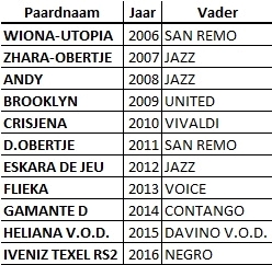 De kampioenen sinds 2006 staan in de tabel hiernaast. De merrie Wiona-Utopia komt uit dezelfde moeder als de KWPN-goedgekeurde hengst Vivaldi. Inmiddels heeft Wiona-Utopia de predicaten elite, sport en PROK.