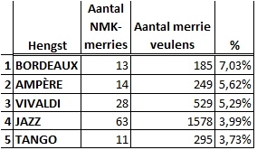 Als we de aantallen driejarige stermerries die hebben deelgenomen aan de NMK, afzetten tegen het aantal merrieveulens die deze hengsten hebben geleverd ziet de top 5 er uit zoals in de tabel hiernaast.