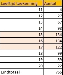 Het moge duidelijk zijn dat een merrie dus nakomelingen moet hebben die oud genoeg zijn om deze sportprestaties te behalen. Als we kijken naar de merries die na 1997 zijn geboren en in de afgelopen 10 jaar het prestatiepredicaat hebben gekregen – in totaal 766 merries - dan is de gemiddelde leeftijd zo rond de 15 t/m 17 jaar, zie onderstaande tabel.