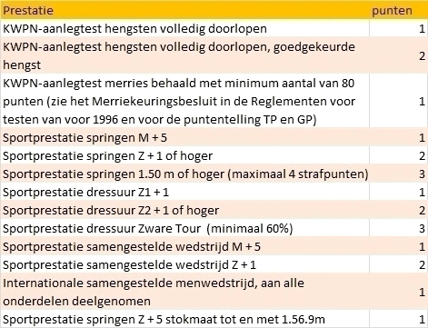 Voor merries kennen we de volgende predicaten: ster, keur, PROK, D-OC, IBOP, EPTM, elite, sport, preferent en prestatie. Als een merrie een predicaat heeft, staat dit vermeld op het stamboekpapier. Het predicaat prestatie geeft de verervingskracht van een merrie aan op het gebied van sport. Ook dit predicaat is van grote waarde voor een fokmerrie. Het betekent dat haar nakomelingen goed presteren in de sport. Om dit predicaat te behalen moet een merrie met maximaal drie nakomelingen minimaal vijf punten behalen volgens het systeem dat in de Merriekeuringsbesluiten (Reglementen) is uitgewerkt. Een merrie met bijvoorbeeld twee nakomelingen die Z-springen met winstpunten lopen en één die M-springen met vijf winstpunten is, heeft precies vijf punten en dus genoeg voor het prestatiepredicaat. De puntentelling is als volgt: