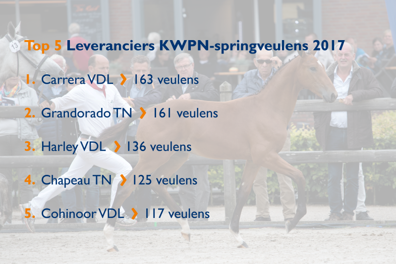 Waren bij de top 5 leveranciers van de dressuurhengsten grote onderlinge verschillen qua aantallen, voor de springveulenleveranciers gaat dit niet op. Met slechts enkele veulens meer dan de hoofdleverancier van 2016 gaat dit jaar de KWPN-erkende Carrera VDL (Cardento x Baloubet du Rouet) aan kop. Hij mocht het afgelopen jaar 163 veulens registeren. Onder Jur Vrieling was de hengst actief op het hoogste niveau en noteerden zij een overwinning in de Grote Prijs van Vestfold. Naast de overwinning in Vestfold wonnen zij ook de Grote Prijs van de Wolden, een 1.50m in Bonheiden en in Oldenburg. Met het Nederlandse team werden zij winnaar van de Nations Cup in Drammen. Afgelopen jaar werd zijn zoon Merlin VDL zesde op de kampioenskeuring van de Nationale Veulenkeuring tijdens de KWPN Kampioenschappen.