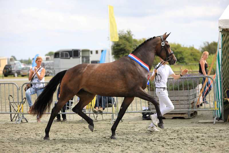 De kampioen werd Kimmy (Winningmood uit Daisy van Oscar, fokker J. Spronk uit Wezep) van Dick Nieuwenhuis en Arjan Nieuwenhuis uit respectievelijk Serooskerke en Vrouwenpolder. Deze merrie scoorde op de stamboekkeuring in Vrouwenpolder vorige maand ook al de hoogste punten, ze werd toen gewaardeerd met 85 voor beweging. Vandaag in Vrouwenpolder herhaalde de merrie haar succes. “Dit is een goed ontwikkelde merrie met goede verhoudingen in het lichaam. Ze heeft een mooie, lichte hoofd-halsverbinding en veel rasuitstraling. Daarnaast heeft ze een goede schoft-schouderpartij. De draf is lichtvoetig met een goede afdruk en in stap laat ze goede ruimte zien.”