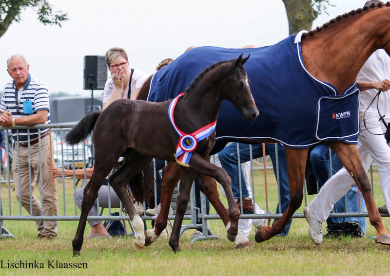 Het merrieveulen Odessa (Johnnie Walker VDL uit G’Avo’s Geneve van Canturano) van G.J. Bosch uit Dalen werd als vijfde geplaatst. “Ze is geboren op 1 juni en daarmee nog een jong veulen. Wel is ze heel correct gebouwd en voldoende bespierd. Wat opviel Ze viel op door haar galop die lichtvoetig is en veel balans heeft.” Zesde werd de Dallas VDL-dochter Odelien DN (uit Fiscalien DN ster voorl. keur van Baltic VDL) van D. Noordhuis uit Wijster. “Dit veulen staat heel goed in het type en heeft goede verhoudingen. Daarbij heeft ze een goede schouftschouderpartij en sterke verbindingen in de bovenlijn. Ze galoppeerde met veel afruk, maar kon vandaag iets meer lichaamsgebruik laten zien.” De tweede nakomeling van de jonge hengst Kitt SB sloot als zevende aan in de kampioenskeuring, dit is Ophelia HV (uit Jady van Ublesco) van A.H. Luning uit Ruinen. “Dit merrieveulen heeft een langgelijnd model en is evenredig gebouwd. Ze galoppeerde met een actief gebruik van het achterbeen.”
