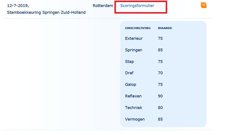 Het scoreformulier bevat alle lineair beoordeelde kenmerken van de keuring. Naast de, in onderstaande afbeelding zichtbare totaalscores, staat er een link ‘scoreformulier’. Onder deze link vindt u het pdf-bestand van het lineair scoreformulier van uw paard. Middels deze optie heeft u alle gegevens van uw paard overzichtelijk verzameld op één pagina in Mijn KWPN.