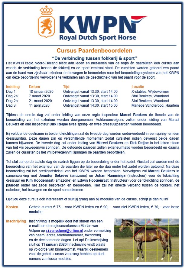 Het KWPN regio Noord-Holland biedt aan leden en niet-leden van de regio èn daarbuiten een cursus aan waarin de verbinding tussen de fokkerij en de sport centraal staat. De cursisten worden geleerd een paard aan de hand van zijn/haar exterieur en bewegen te beoordelen naar het beoordelingssysteem van het KWPN om deze beoordeling vervolgens te verbinden aan de geschiktheid van het paard voor de sport.