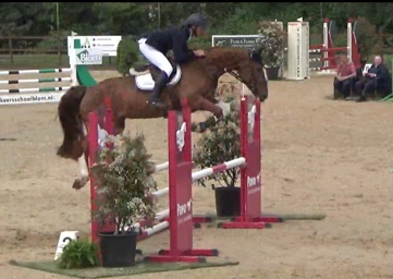 en de even oude ruin Krazy Express T (Global Express uit Premiere keur van Lux) van fokker A.L.M. Timmers uit Etten-Leur met 80,5 punten. “De Kannan-merrie is een lichtvoetig galopperende merrie die daarin ruim voldoende ruimte heeft. Ze springt telkens met hele goede reflexen, goed naar boven en heeft daarbij veel lichaamsgebruik”, licht inspecteur Arnold Kootstra toe. “Ze springt telkens mooi van de eerste paal, maakt de sprong achter goed af en laat zich heel goed bewerken. Voor zowel de techniek als de rijd- en bewerkbaarheid verdiende deze getalenteerde merrie een 9.” Ook de ruin Krazy Express T viel op met zijn goede rijd- en bewerkbaarheid, waarvoor hij eveneens een 9 kreeg. “Deze vierjarige Global Express-zoon beweegt op een gemakkelijke manier en heeft een fijne, voldoende actieve galop. Hij liet een constante verrichting zien, waarbij hij met een goede voorbeentechniek en reflexen springt. In alles zou hij een fractie vlugger mogen zijn maar hij springt altijd mooi van de eerste paal, toont een goede techniek en ruim voldoende vermogen. En hij laat zich dus al heel goed rijden en bewerken.”