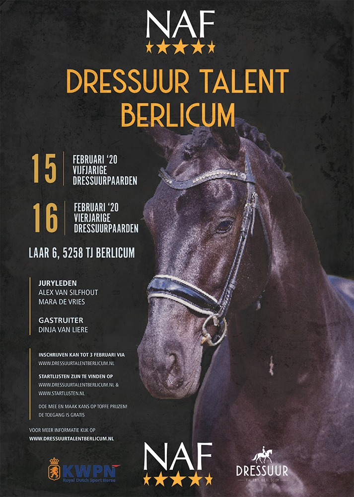 Op 15 en 16 februari 2020 wordt voor de achtste keer het NAF Dressuur Talent Berlicum georganiseerd voor vier- en vijfjarige dressuurpaarden. Niemand minder dan bondscoach Alex van Silfhout beoordeelt de paarden samen met Mara de Vries op hun gangen en aanleg. Dinja van Liere zal de paarden in de finale overrijden. Na enkele jaren als bondscoach van de Nederlandse jeugdruiters, werd Alex van Silfhout in 2019 benoemd als bondscoach van de senioren. Hij was zelf succesvol in de internationale Grand Prix en begeleidde al vele ruiters naar dit niveau, waaronder zoon Diederik van Silfhout. Mara de Vries verwierf haar bekendheid al als jeugdamazone, maar kwam na meerdere EK’s bij de pony’s en junioren ook uit op Grand Prix-niveau. Mara bracht al twintig paarden uit in de Lichte Tour en heeft daarmee de nodige kennis in huis. Dinja van Liere is de afgelopen jaren ongekend succesvol in het opleiden van verschillende jonge paarden. Deze sympathieke Grand Prix-amazone won meerdere medailles op het WK voor Jonge Dressuurpaarden.