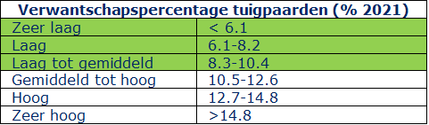 Binnen het hengstenbestand zijn er verwantschapskwalificaties van ‘zeer laag’ tot ‘zeer hoog’ (zie onderstaande tabel).
