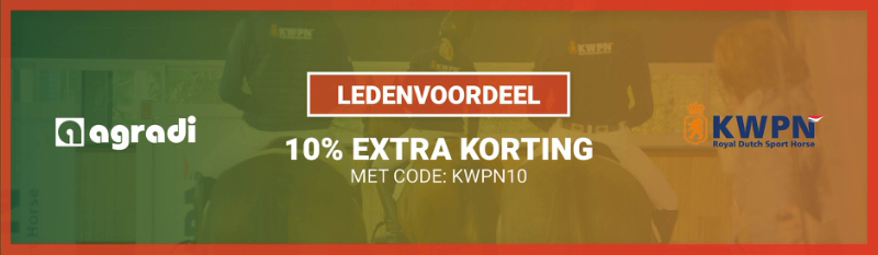 Agradi en KWPN slaan de handen ineen. Als KWPN-lid profiteer je mee van deze nieuwe samenwerking en ontvang je ledenvoordeel op de producten van Agradi. Je kunt nu gebruik maken van de code KWPN10. Met deze code ontvang je 10 procent korting over je gehele winkelwagen.