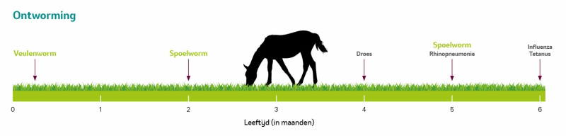 - Behandel op het juiste moment. Bijvoorbeeld tegen spoelwormen wanneer het veulen 2 en 5 maanden oud is.
