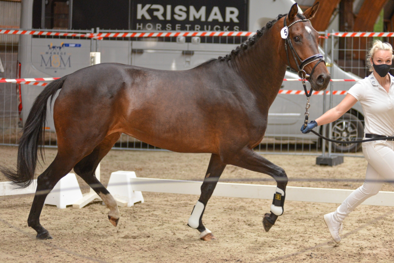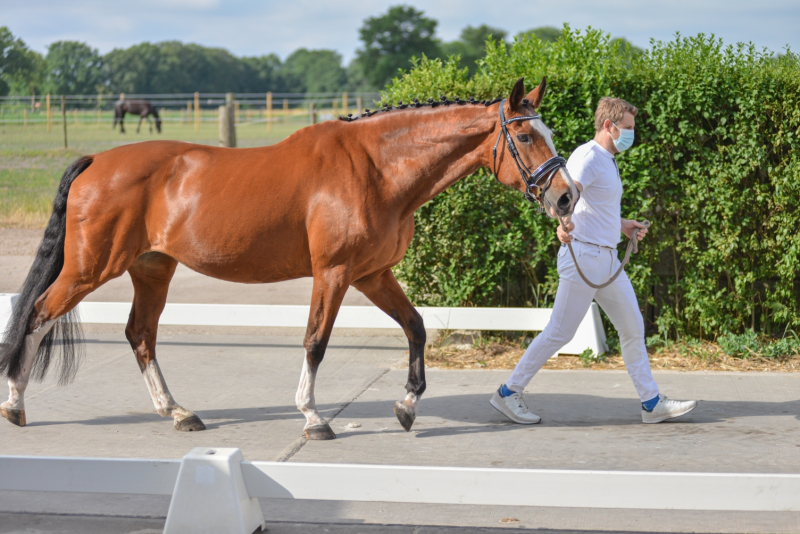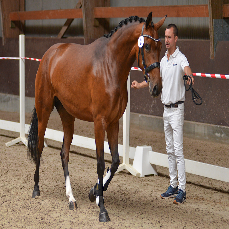 Geregistreerde van My Indian Dream SVB, Steve van Bambost uit Sint Truiden kwam meteen erna met nog een troef in de baan. Deze Just Me Jellybean (v.Sorento) is via Vivianne van Vlaswinkel een halfzus van My Indian Dream SVB. Ze kreeg van de jury 70 voor exterieur, 80 voor beweging en maar liefst 85 voor haar draf: “Dat doet ze heel elegant met een mooi gebruik van het voorbeen, daarbij schakelt ze heel makkelijk. In galop toont ze ruimte en balans.” Na het behalen van het sterpredicaat werd ze tijdens de Centrale Keuring ook voorlopig keur. Steve Van Bambost en Evelien Neven runnen samen SVB Dressage, een trainingsstal voor jonge paarden in Sint-Truiden. Evelien: “We houden ons voornamelijk bezig met het zadelmak maken en opleiden van dressuurpaarden. Tegelijkertijd stampen we stilaan onze eigen fokkerij uit de grond. We beschikken momenteel over zes zelf gefokte merries, die we op termijn zullen inzetten in de fokkerij. Op de stamboekkeuring in Peer stelden we twee van deze merries voor, de halfzussen My Indian Dream SVB uit 2017 en Just Me Jellybean uit 2014. Beide merries zijn dochters van de voorlopig keurmerrie Vivianne van Vlaswinkel. Steve kocht Vivianne als driejarige bij stoeterij De Radstake en zette haar in als fokmerrie. Met succes, want haar eerste nakomeling Suave van Sorento liep een IBOP van 82 punten en haalde de finale van de PAVO Cup in 2011. Vandaag brachten we de volle zus van Suave mee naar de stamboekkeuring. Deze Just Me Jellybean heeft een bijzondere geschiedenis achter zich. Ze werd namelijk geboren uit een tweeling; haar broertje stierf vlak na de geboorte. Tegen alle verwachtingen in groeide Jellybean uit tot een dappere, sterke en gezonde merrie. Als vijfjarige bracht ik haar uit in de SBB Competitie voor Jonge Paarden in België. Tijdens de nationale finale behaalden we de bronzen medaille. Een jaar later kreeg Jellybean een knap hengstveulen van Le Formidable. Voor 2022 verwacht ze een veulen van Fürst Toto. Tussendoor wordt ze klaargemaakt voor het Z, met het oog op de volgende predicaten. Haar halfzus My Indian Dream SVB is een dochter van Indian Rock. In 2016 zagen we hem in de kooi tijdens de tweede bezichtiging van de KWPN hengstenkeuring. Onze hengstenkeuze voor Vivianne was destijds meteen gemaakt. We kunnen alleen maar blij zijn met het resultaat: My Indian Dream is een nuchter, werkwillig paard met drie uitstekende basisgangen. Vorige week werd ze voor het eerst uitgebracht op wedstrijd en won ze meteen de rubriek voor 4-jarigen. De focus ligt bij haar eerst op de sport, maar na verloop van tijd zal zij eveneens ingezet worden in de fokkerij. We proberen onze fokproducten steeds aan te houden tot ze onder het zadel zijn. Het is fantastisch om hen te zien opgroeien en er dan zelf mee aan de slag te gaan!”
