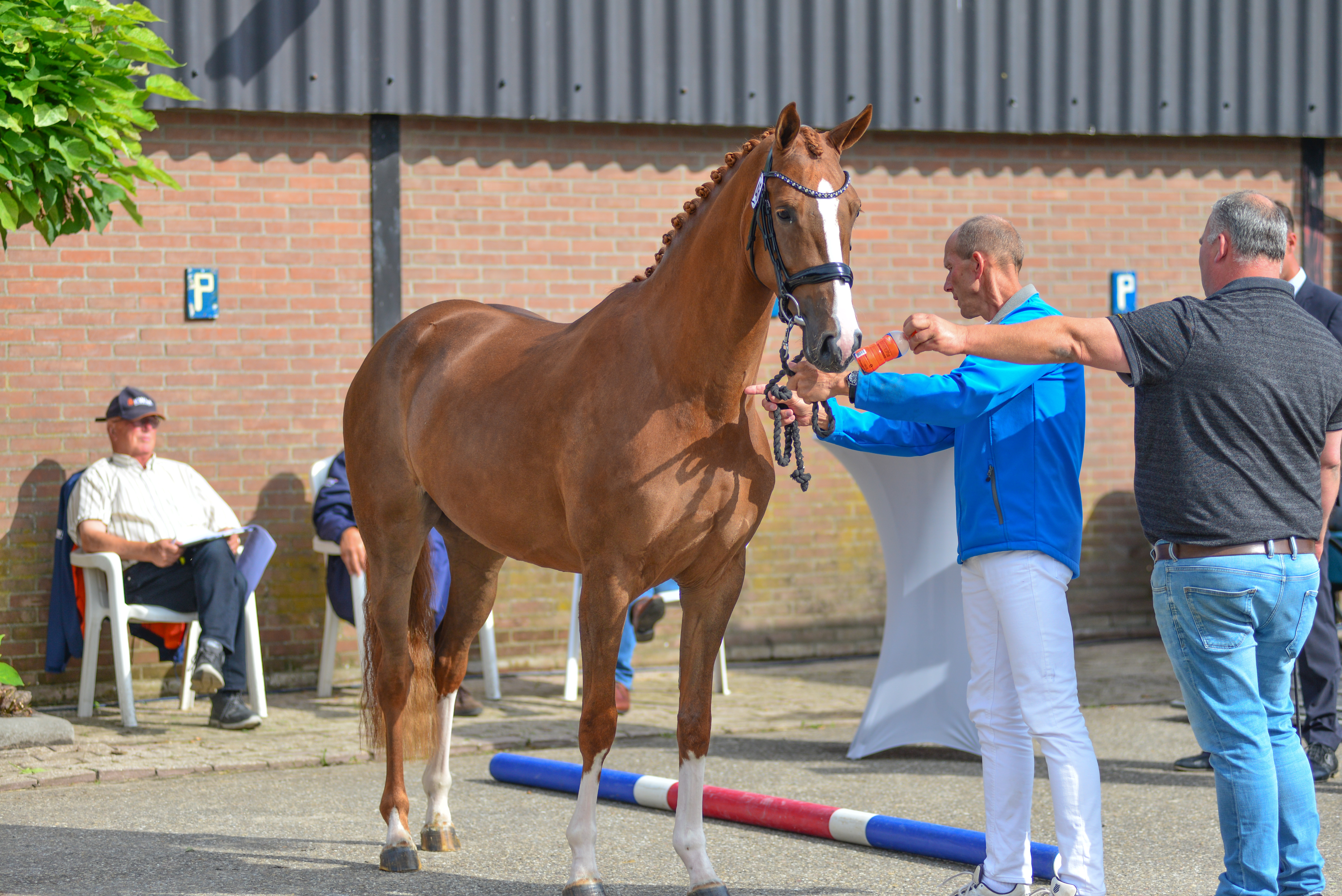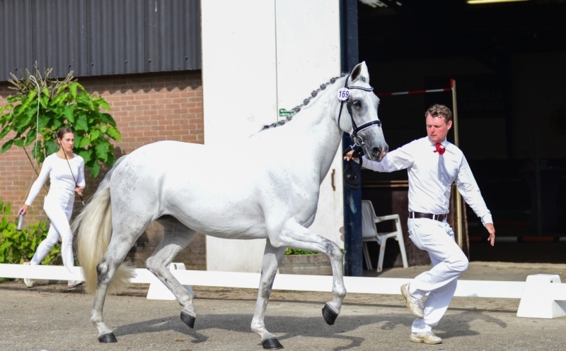 Mark de Groot van Hengstenhouderij Landzicht in Giessenburg is gespecialiseerd in tuigpaarden maar stelde nu in de baan voor het dressuurpaard Hope (v.Chinook). Een schimmelmerrie, in de dressuurrichting een nog maar zelden voorkomende kleur. Echtgenote Eva bracht Hope uit in de sport, tot Z1 met twee winstpunten. De jury oordeelde: “Een royaal ontwikkelde merrie met uitstraling. Haar hals staat er goed op. Ze beschikt in beweging over een goede beentechniek en veel souplesse. Galopperen doet ze lichtvoetig en mooi bergop.” Hope werd dan ook keur verklaard. Haar schimmelkleur komt bij Abgar vandaan. Als moeder staat de voorlopig keurmerrie Uwinnie (v. Krack C) op papier. Hope is gefokt en staat geregistreerd bij Hengstenhouderij Landzicht.
