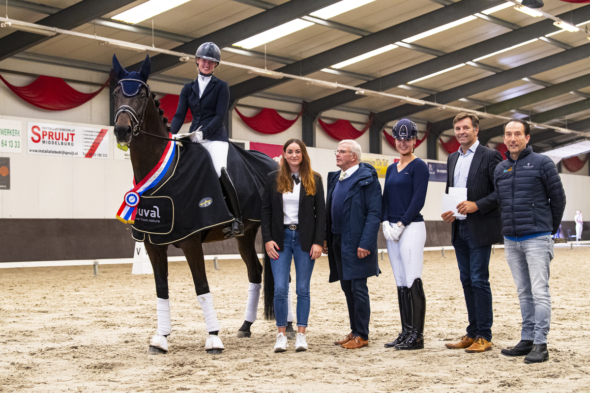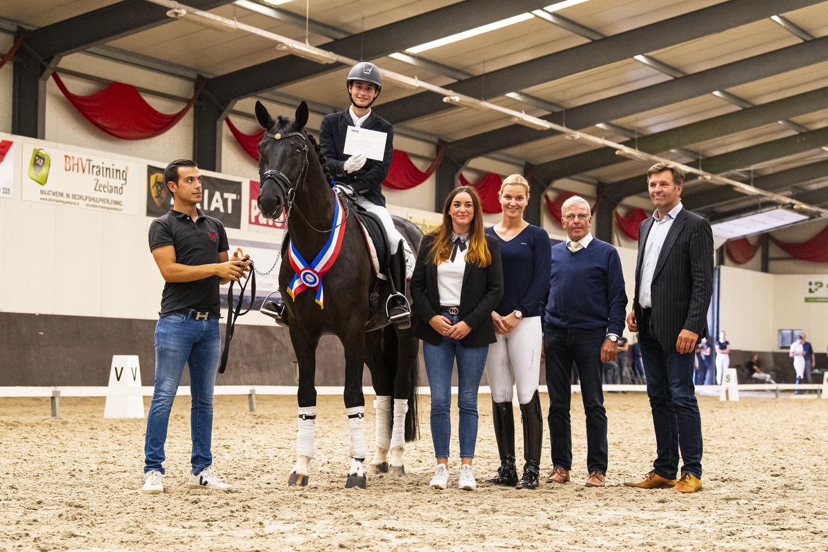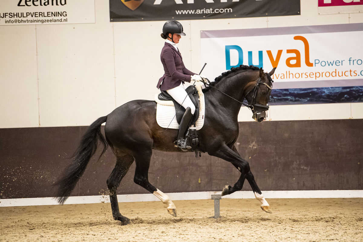 Op de tweede plaats eindigde de elite EPTM-(dres) merrie Luna (v. Governor uit Elmara voorl keur v. Zhivago x Weltmeyer) die door Jessica Nijpjes werd voorgesteld. Luna is gefokt door wijlen Jas Haak uit Philippine, de Zeeuws fokker van het jaar 2019. Livi en Petra Verschuren uit Hoek kochten Luna als veulen bij de fokker. “We gingen het veulen op de video zetten om haar aan te bieden voor een veulenveiling. Maar we waren zo weg van haar dat we haar zo uit de wei hebben gekocht.” De palmares van de merrie is op haar jonge leeftijd al groot. Ze liep als driejarige een EPTM van 82,5 punten en werd op de Centrale Keuring in Zeeland reservekampioen en werd afgevaardigd naar de NMK. Ze deed mee aan de halve finale van de PAVO Cup en won brons op de Hippiade in het M1. “Ik ben haar in eerste instantie zelf gaan rijden, maar ze is voor mij te wakker en te vlug, je moet altijd alert zijn op haar. Ze heeft alles in huis om een heel goed sportpaard te worden, daarom hebben we haar in training gezet bij de zusjes Nijpjes. Haar grootste kwaliteit is haar go, sterke achterbeengebruik en haar drie goede gangen. We beleven heel veel plezier aan haar op deze manier, zowel in de sport als in de fokkerij. We hebben al twee embryo’s uit haar gespoeld. Één ervan is Racoon (v. Kjento) die dit jaar op de NVK op de 4e plaats eindigde. Ook dit jaar hebben we een embryo gespoeld van Jameson RS2. Ik wil een grote pluim geven aan Jessica en Chantal dat ze zo hard gewerkt hebben met Luna, ze hebben het niet cadeau gekregen met Luna en als je dan ziet dat de gastamazone er nu zo mee weg kon rijden, dat maakt me wel erg trots.”