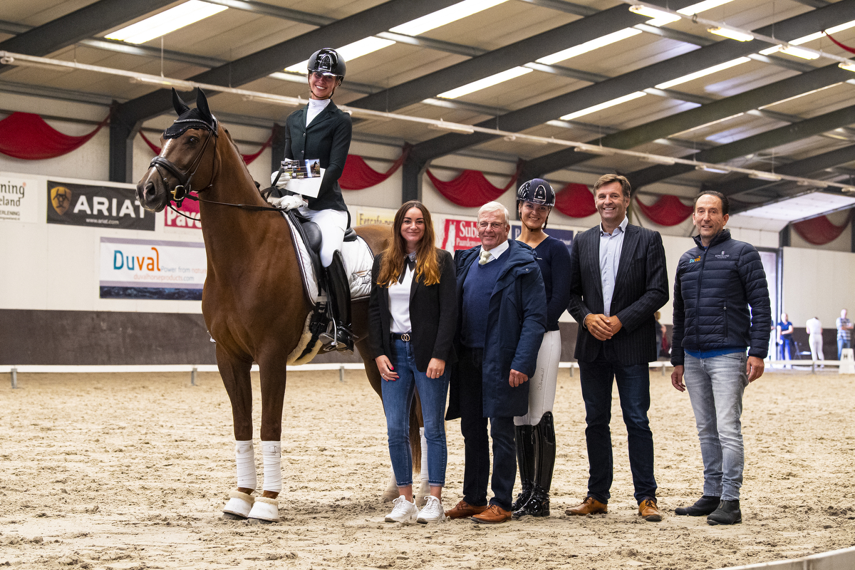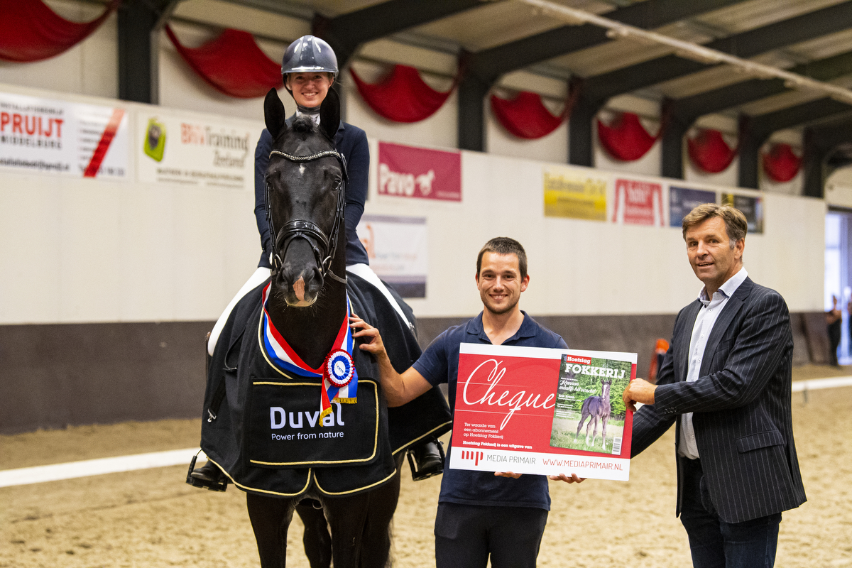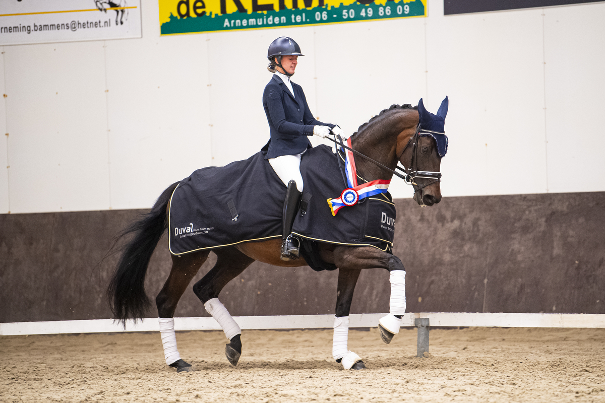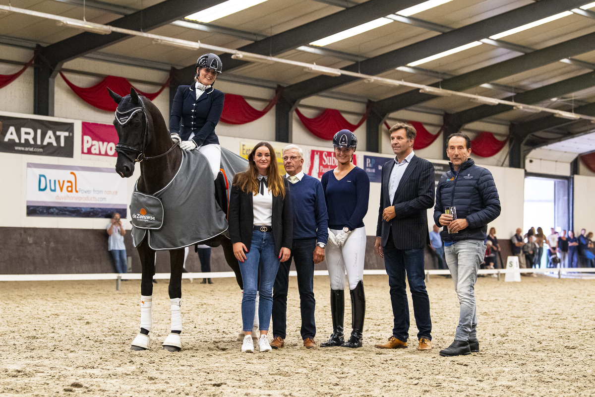 Op de tweede plaats eindigde de elite EPTM-(dres) merrie Luna (v. Governor uit Elmara voorl keur v. Zhivago x Weltmeyer) die door Jessica Nijpjes werd voorgesteld. Luna is gefokt door wijlen Jas Haak uit Philippine, de Zeeuws fokker van het jaar 2019. Livi en Petra Verschuren uit Hoek kochten Luna als veulen bij de fokker. “We gingen het veulen op de video zetten om haar aan te bieden voor een veulenveiling. Maar we waren zo weg van haar dat we haar zo uit de wei hebben gekocht.” De palmares van de merrie is op haar jonge leeftijd al groot. Ze liep als driejarige een EPTM van 82,5 punten en werd op de Centrale Keuring in Zeeland reservekampioen en werd afgevaardigd naar de NMK. Ze deed mee aan de halve finale van de PAVO Cup en won brons op de Hippiade in het M1. “Ik ben haar in eerste instantie zelf gaan rijden, maar ze is voor mij te wakker en te vlug, je moet altijd alert zijn op haar. Ze heeft alles in huis om een heel goed sportpaard te worden, daarom hebben we haar in training gezet bij de zusjes Nijpjes. Haar grootste kwaliteit is haar go, sterke achterbeengebruik en haar drie goede gangen. We beleven heel veel plezier aan haar op deze manier, zowel in de sport als in de fokkerij. We hebben al twee embryo’s uit haar gespoeld. Één ervan is Racoon (v. Kjento) die dit jaar op de NVK op de 4e plaats eindigde. Ook dit jaar hebben we een embryo gespoeld van Jameson RS2. Ik wil een grote pluim geven aan Jessica en Chantal dat ze zo hard gewerkt hebben met Luna, ze hebben het niet cadeau gekregen met Luna en als je dan ziet dat de gastamazone er nu zo mee weg kon rijden, dat maakt me wel erg trots.”