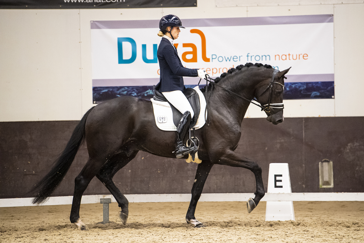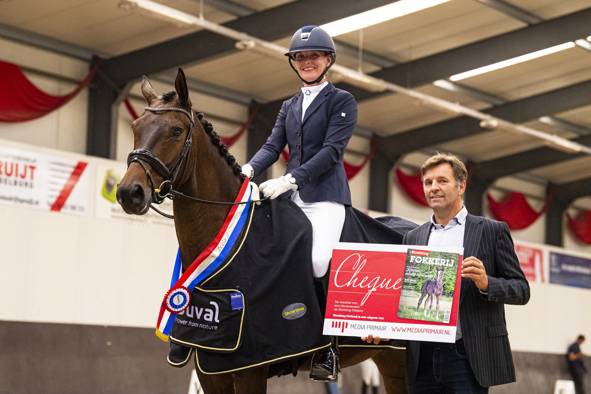 De jury had alleen maar superlatieven voor Dreamboy-zoon Mercurius ACM (vm. Gribaldi, fok. C.C. Meegdes, Hoogerheide). Hij kreeg 90 punten totaal voor de verrichting en de ultieme 10 voor het overrijden. Voor de draf kreeg hij een 9,5, voor de stap een 8,5 en voor de overige onderdelen een 9. Johan Hamminga: “Mercurius is een paard die heel sterk beweegt en opvallend is in zijn gedragenheid en balans. Die draf! Daar kun je de klok op gelijk zetten, zo zuiver in de de takt. Dit is een paard met abnormaal veel kwaliteit.” Mercurius ACM won vorig jaar al de rubriek vierjarigen, werd 7e in de finale van de PAVO Cup, won de Subli Cup in Werkendam en werd ook L2 Hippiade kampioen. Amber Hage stelde Mercurius, zoals we van haar gewend zijn inmiddels, weer professioneel voor. “Dit is echt een droompaard, het is elke dag genieten met hem. In de proef geeft hij altijd een beetje extra. Ik ga proberen zo hoog mogelijk met hem te komen in de sport!” En dat beetje extra, dat hebben we allemaal kunnen zien in de prijsuitreiking. Wat een paard!