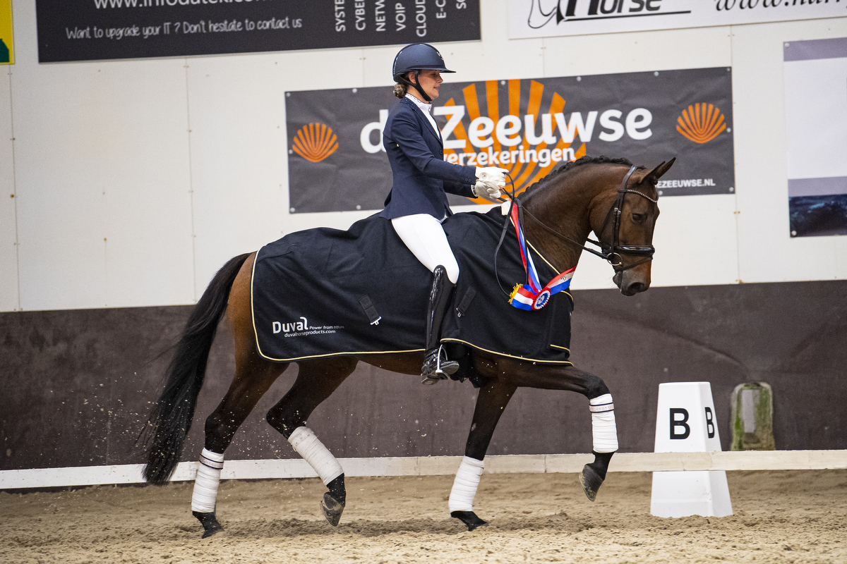 Hoofdsponsor Duval Horse Products heeft in Duvals Kapri Son (v. Capri Sonne Jr x San Remo) het overall beste Zeeuws gefokte paard. Hij eindigde bij de zesjarigen op de tweede plaats met 87 punten totaal en een 9,5 voor het overrijden door gastamazone Emma van den Hooven. Hij kreeg negens voor de draf, galop en aanleg. Duvals Kapri Son is een heel knappe verschijning die qua looks veel weg heeft van zijn vader. Daarnaast is hij ijverig en laat zich heel goed sluiten. Maxime Osse van Max Equine kreeg Kapri twee jaar geleden te rijden van de fokker Jan Cees van der Endt. “Ik vind hem echt een heel erg fijn paard, echt een stoer paard met heel veel kwaliteit die scherp is op de juiste manier.”
