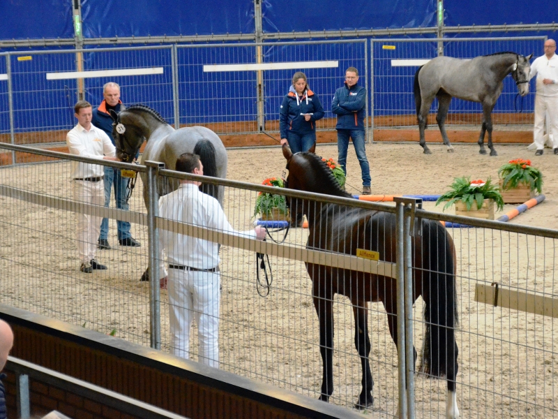 Emerald van ’t Ruytershof (4) en zijn vader Diamant de Semilly (2) kregen beide meerdere zonen geselecteerd. Eerstgenoemde was de hoofdleverancier bij de springhengsten in de eerste bezichtiging, vandaag zijn er zes beoordeeld. “We hebben van diverse Belgische vaders zonen in de baan gehad vandaag. Bij de Emeralds valt op dat er qua exterieur nog wel wat op aan te merken is, en ze zijn weinig uniform, maar bij het springen waarderen ze zich duidelijk op”, vertelt Cor Loeffen. “Het was zeker een interessante dag vandaag en we hebben weer een stel complete hengsten kunnen toevoegen aan de collectie voor de tweede bezichtiging. Daarmee bedoel ik hengsten die zowel qua exterieur, afstamming als vrij springen een positieve indruk maken. Daarnaast hebben we goed kunnen selecteren op maat en vermogen, en dat de hengsten atletisch zijn bij het springen. Op het straatje hebben we wel wat bemerkingen moeten maken, zo zagen we meerdere malen hengsten met verschillende voorvoeten.” Morgen staat de vierde en laatste reguliere dag van de eerste bezichtiging voor springhengsten gepland in Ermelo.
