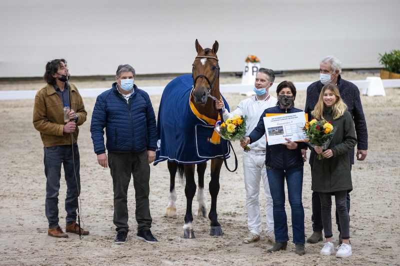 Alexandro P is gefokt bij de familie Peters in Stokkum. Zij waren uiteraard aanwezig bij deze huldiging. Alsmede eigenaar Bertus Verwaijen. Jammer genoeg vond deze uitreiking plaats zonder publiek want dat had dit vaderpaard bij uitstek zeker verdiend. Wim Versteeg lichtte toe: “Alexandro P kreeg al in 2017 het predicaat keur. Inmiddels zijn er twee zonen van hem goedgekeurd voor de Gelderse fokrichting, te weten Henkie en McKenzy JHL. Vandaag werd zijn kleinzoon Olaf geprimeerd.