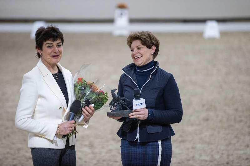 “Vanuit het KWPN, wil ik je heel graag bedanken voor al je inzet de afgelopen jaren”, trapt Marieke af. “Je bent negen jaar heel betrokken geweest en je hebt altijd op een buitengewoon objectieve en transparante manier gejureerd. Daarbij ben je altijd heel duidelijk geweest in je manier van communiceren, zonder negatieve ondertoon. We zijn er dankbaar voor dat je altijd op zo’n manier betrokken bent geweest. Je hebt een enorm KWPN-hart en daar willen we je voor bedanken met een gouden KWPN-speld. Je blijft nog betrokken bij het KWPN als jurylid, dus we nemen zeker geen afscheid van je.”