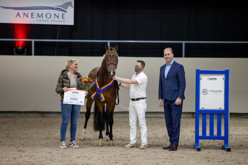 Voor Willeke Bos van Stal 104 kon de hengstenkeuring al niet meer stuk want ze kreeg maar liefst vijf hengsten aangewezen. Drie daarvan mochten terugkeren voor de primering van de dressuurhengsten, mede mogelijk gemaakt door Hippo Horse Insurance. Onder hen One-Two-Three (Vivaldi uit Tolivia elite sport-dres pref prest PROK van D-Day), een volle broer van de KWPN-erkende Lichte Tour-hengst Vitalis. “Dit is een elegante, langgelijnde hengst die met veel lossigheid, balans en lichtvoetigheid beweegt”, lichtte Bert Rutten toe. In de premiering keerden van Stal 104 twee zonen van hun Olympische hengst All At Once terug. De uit een uitzonderlijk geteste moeder (IBOP 90,5 punten) gefokte Opoque (uit Ice Princess STH elite IBOP-dres sport-dres PROK D-OC van Davino V.O.D.) werd gefokt door Stal 104 en is nu voor de helft in handen van Andreas Helgstrand. “Deze hengst heeft een waardevolle afstamming en beweegt met een goed lichaamsgebruik en veel schakelvermogen.” De tweede All At Once-zoon binnen dit gezelschap is de fraaie Otazu (uit de Lichte Tour-merrie Atilinda M elite IBOP-dres sport-dres pref prest D-OC van Negro) van fokker Stal 104, die daarmee uit dezelfde moeder komt als de opvallende KWPN-goedgekeurde hengst Jameson RS2 (v.Blue Hors Zack). “Opnieuw een hengst met een hoge verwachtingswaarde. Hij combineert een aansprekend exterieur met veel souplesse en schakelvermogen in beweging.”