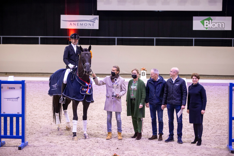 Monique Peutz vertelt namens de jury: “Dit was de laatste combinatie van vandaag, maar het was zeker de moeite waard om even voor te blijven zitten! We hebben echt genoten met zijn allen. Er was in de proef zo’n fijne samenwerking tussen ruiter en paard. De stap is heel krachtig. In de draf vielen de mooie scharende appuyementen op, zo mooi in balans. In galop toont de hengst veel sprong en vermogen om te schakelen.” Jheronimus (uit A.Bertje ster pref prest PROK van Jazz, fokker W.P.S van Weert uit Beesd) bezette onder Kirsten Brouwer een tweede plaats in het tussenklassement, maar kwam in de finale niet van start.
