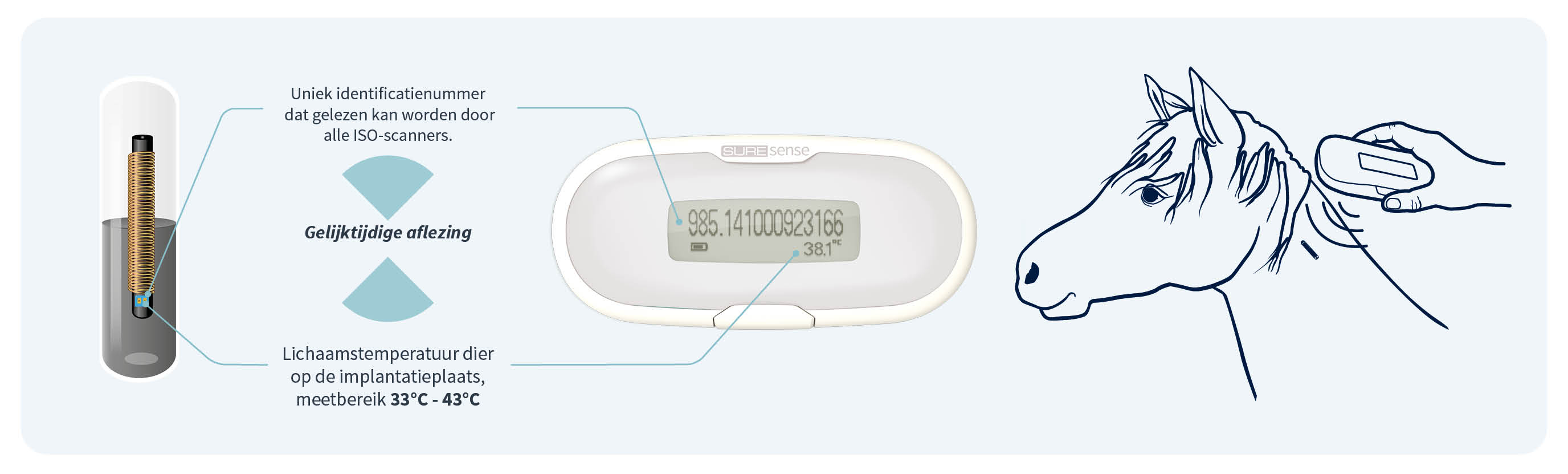 De Thermochip, maakt niet alleen het aflezen van het ID nummer mogelijk, maar meet tegelijkertijd ook de temperatuur van het dier op de implantatieplaats. Hoewel dit niet het meten van de rectale temperatuur vervangt, kan het monitoren van trends in het temperatuurverloop bijvoorbeeld aanleiding zijn om verder onderzoek te doen. Bovendien kan het een hulpmiddel zijn om een naderende bevalling te detecteren(1). In groepsverband (denk aan een opfoksituatie) zou het monitoren van het temperatuurverloop van meerdere dieren over langere tijd, een extra tool kunnen zijn bij het vroeg signaleren van een uitbraak van besmettelijke ziektes als Droes of Rhinopneumonie.(2)