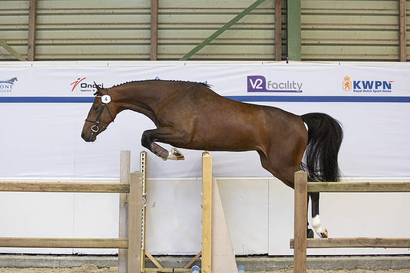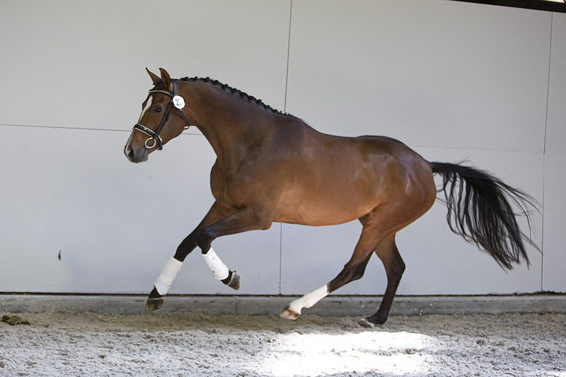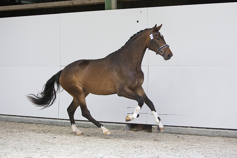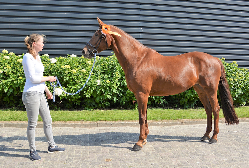 De dressuurpaarden werden beoordeeld door regio-inspecteur Floor Dröge, Henk Dirksen en Brecht D’Hoore. De laatste was aanwezig als aspirant-jurylid en lichtte, dit jaar voor het eerst, ook een aantal te keuren merries toe. Floor: “We kregen vandaag zes driejarige merries in de baan. Hiervan hebben we er vijf beoordeeld en hebben er twee het sterpredicaat gekregen. De hoogste score was voor Odin-Tina, een dochter van Hermès uit Ratina L, een prok, preferente prestatie- en stermerrie van Lancelot. Voor exterieur kreeg ze 75 en voor beweging 80. Een goed ontwikkelde langgelijnde merrie met veel uitstraling en een aansprekende voorhand. Stappen deed ze met veel takt en ruimte en in galop liet ze een opvallend goede balans zien.” Odin-Tina komt uit een predicaatrijke merrielijn met daarin verschillende internationale dressuur- en springpaarden. Als fokker staat te boek M.A. van de Goor uit Herpen en ze is nu geregistreerd bij M.C.H.I. Rentmeester in Ovezande.