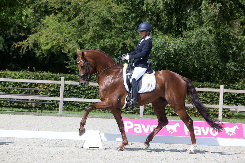 Met een 9 voor de draf liep de goed geteste O-Minka SB (Incognito uit K-Minka D-OC van Governor, fokker T. Postma uit Munein) onder Wendy Kuiken naar 82 punten en de vijfde plek. “Dit is een goed gemodelleerd dressuurpaard dat met name opviel in de draf. De stap is zuiver in de viertakt en heeft voldoende ruimte, maar zou nog iets vloeiender vanuit het achterbeen door kunnen treden. De draf typeert zich door veel afdruk, heel veel beentechniek en opvallende schoudervrijheid. Daarbij heeft ze weinig tempo nodig. De galop heeft een goede afdruk, daarin zou ze nog wat meer bodem mogen pakken.”