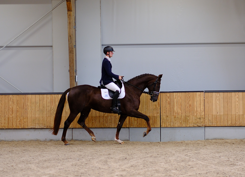 Odette Kim was vandaag de enige deelneemster die aangespannen werd voorgesteld. Marcel van Bruggen hield bij de dochter van Edmundo de leidsels in handen. Jan Pen lichtte toe: “Deze merrie is rijtechnisch nog wat groen, dat zie je vooral terug in haar niet altijd correcte stelling en buiging. Stappen deed ze actief maar zou daarin even wat meer ruimte mogen tonen. In draf liet ze een hele fijne beentechniek zien en voor haar galop konden we maar liefst een negen kwijt. Hierin bleef ze mooi bovenin, toonde een goede houding en gedragenheid met een sterk gebruik van het achterbeen.”