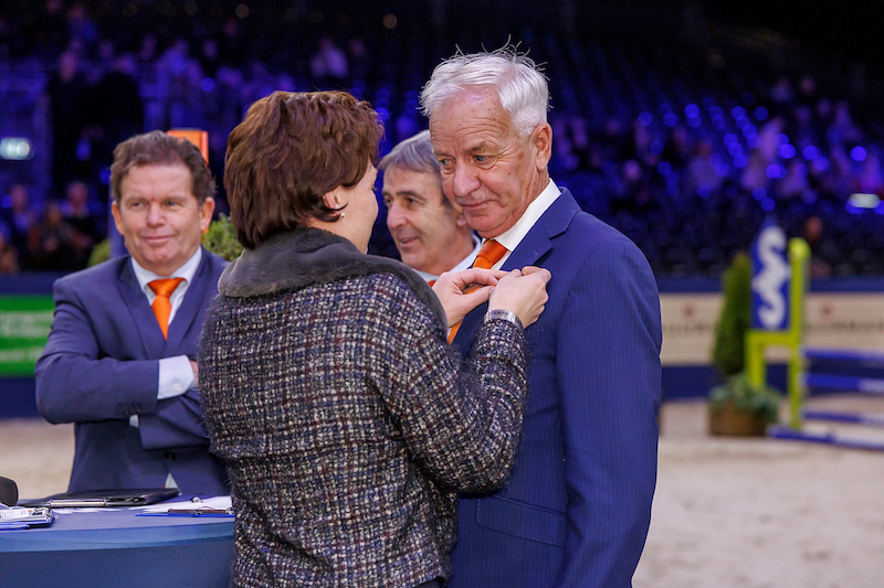 Cor Loeffen werd op de KWPN Stallion Show verrast met een Gouden Speld uit handen van voorzitter van het Algemeen Bestuur Andries van Daalen. Een blijk van waardering voor de jarenlange inzet van de paardenman die zijn gevleugelde uitspraak “Beter evolutie dan revolutie” altijd hoog in het vaandel hield.