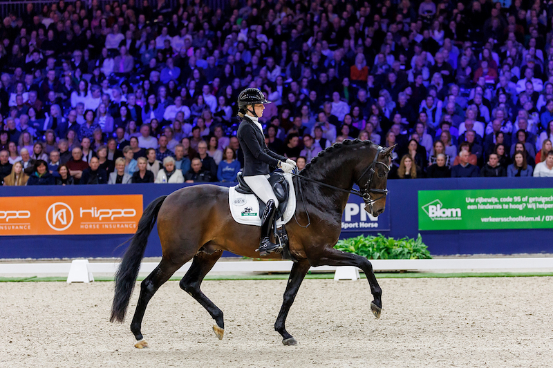 “Wat vooral opvalt aan deze hengst is zijn elegantie, lichtvoetigheid en schoudervrijheid”, licht Marian winnaar Merlot VDL toe. “Hij is heel gewillig en de proef wordt correct uitgevoerd. Door de entourage was hij in het begin van de proef iets in zichzelf gekeerd, gedurende de proef zagen we dat hij zich steeds meer thuis ging voelen in Den Bosch. Het begin was daardoor een klein beetje voorzichtig, maar in het tweede gedeelte van de draftour begon hij heel mooi door te trekken vanuit het achterbeen. In galop zagen we twee correct uitgevoerde wissels, met name de tweede was heel mooi doorgesprongen. Hij kan goed schakelen en mag voor nog hogere punten nog iets meer kracht vanuit het achterbeen ontwikkelen. Dit is een paard dat zich heel fijn laat bewerken, correct werd voorgesteld en werkwillig is.”