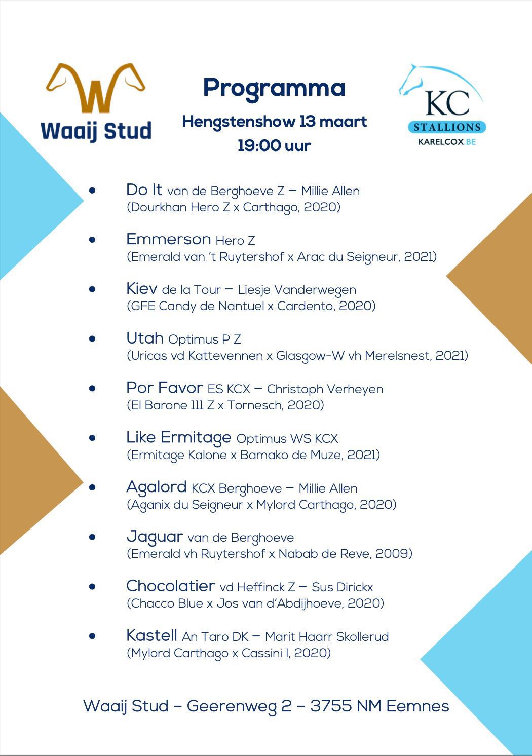 Voor het dekseizoen van 2024 is Waaij Stud wederom een samenwerking aangegaan met KArel Cox Stallions uit België om zo de vermogende Belgische springgenen naar Nederland te brengen. Alle hengsten van Karel Cox Stallions zijn in Nederland beschikbaar via Waaij Stud. Op woensdag 13 maart vanaf 19.00 uur organiseert Waaij Stud de hengstenshow in samenwerking met Karel Cox Stallions. De hengstenshow vindt plaats op Waaij Stud, Geerenweg 2, 3755 NM Eemnes, Nederland. Entree is gratis.