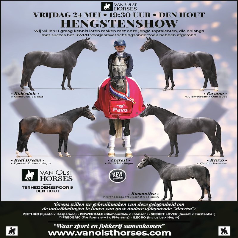 De hengsten worden gepresenteerd op vrijdagavond 24 mei om 19.30 uur bij Van Olst Horses in Den Hout. Wij hopen u hier te mogen begroeten.