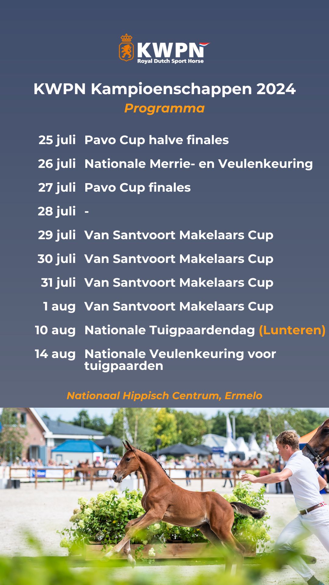 Het is weer bijna zover, vanaf 25 juli tot en met 14 augustus staan de KWPN Kampioenschappen van 2024 op het programma. De KWPN Kampioenschappen geven een spotlight aan de beste KWPN-paarden en -veulens van Nederland.