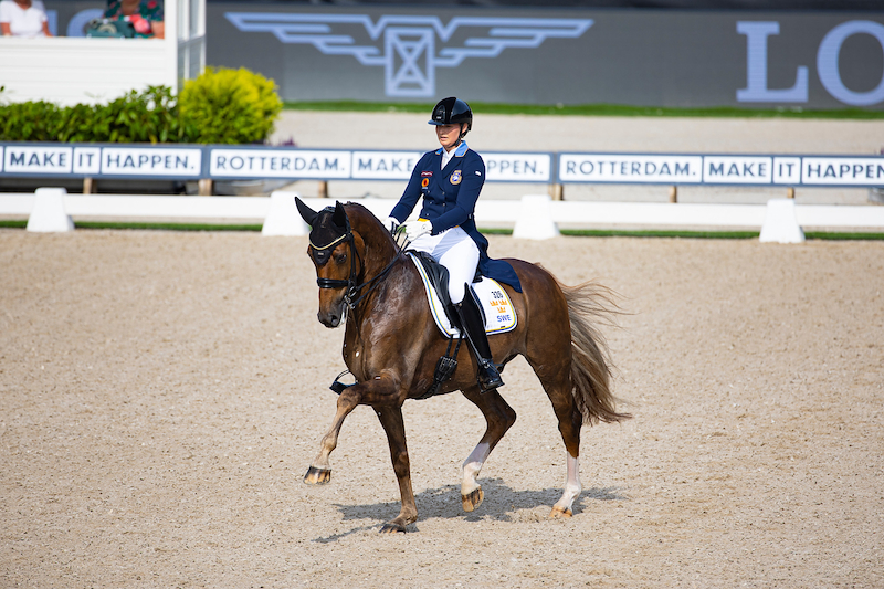 “Robin heeft hem heel netjes opgeleid, maar op een gegeven moment werden de kosten te hoog. Hier thuis heeft Meggie Rooijakkers hem nog even gereden, vervolgens ging hij als vijfjarige van Cindy van Vugt naar Luis Closas. Hij reed hem amper drie maanden toen Jan Brink en Marina Mattsson, samen met Diederik Wigmans, Helix probeerden. Ik had niet lang daarvoor zijn volle broer Gladzone aan Diederik Wigmans en Krista Kolijn verkocht en die is later ook naar hetzelfde adres gegaan. Jan Brink vroeg zich af of ik nog meer van zulke paarden had staan. Zij vonden hem meteen helemaal geweldig en waren dolenthousiast over hem. Hij verhuisde naar de stallen van Hannell Dressage in Zweden. Marina leidde hem verder op voor het grote werk. Hij bleek superveel talent te hebben voor piaffe en passage, wat hij volgens Marina in één dag leerde. Ik ben hem al die tijd blijven volgen en in 2023 zijn we bij hem op het CHIO in Rotterdam wezen kijken, waar hij het beste teampaard van Zweden was.”